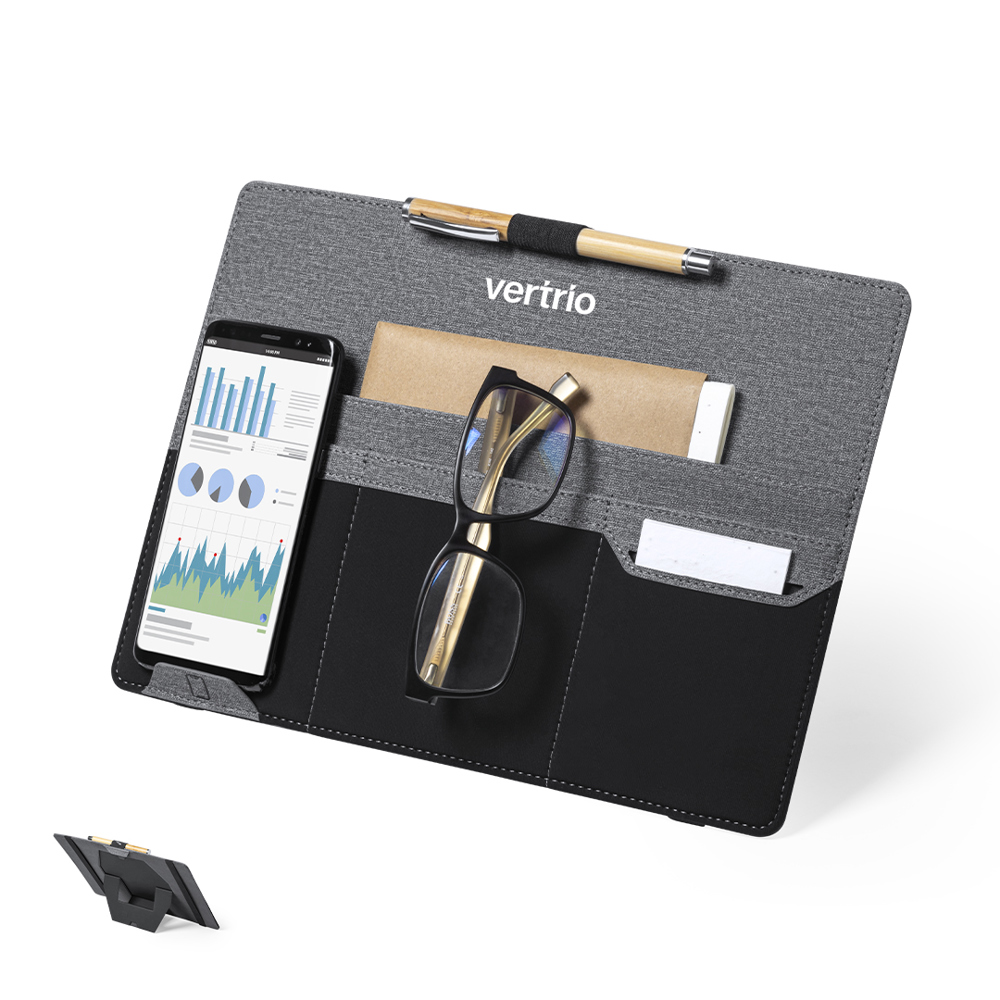Stijlvolle en functionele organiser met magnetische standaard, ideaal om overal gemakkelijk met laptops te werken. Gemaakt van duurzaam, grijs, gemarmerd polyester met zwart gekleurde PU details. Inclusief balpen en smartphonehouder, met 4 elastische vakken voor het opbergen van meerdere gadgets.