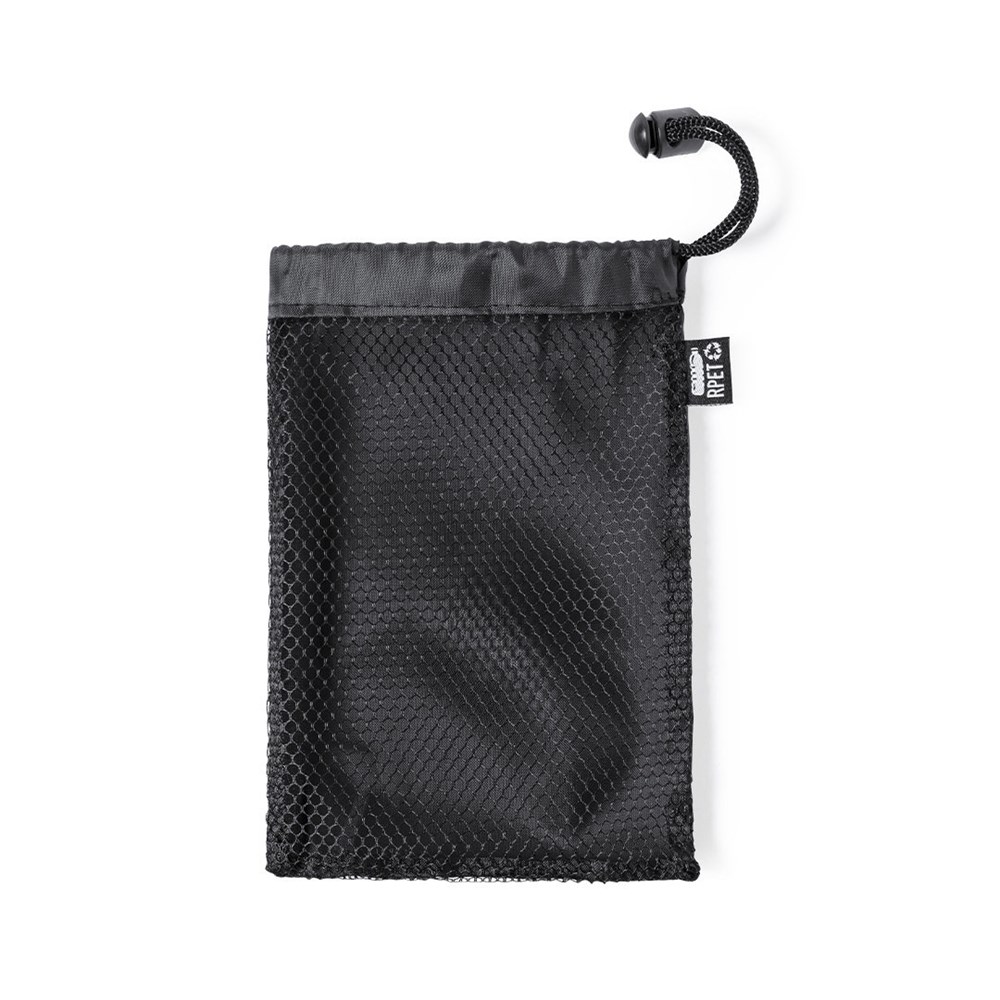 Natuurlijn, absorberende handdoek. In RPET 160g/m2, gemaakt van gerecycleerd plastic om het hergebruik van plastic afval te bevorderen en bij te dragen tot de duurzaamheid van de planeet. Formaat 50x100 cm, aangeboden in een individuele RPET netzak met effen rugzijde en verkrijgbaar in een brede waaier van kleuren. Met RPET-embleem op het etiket.
