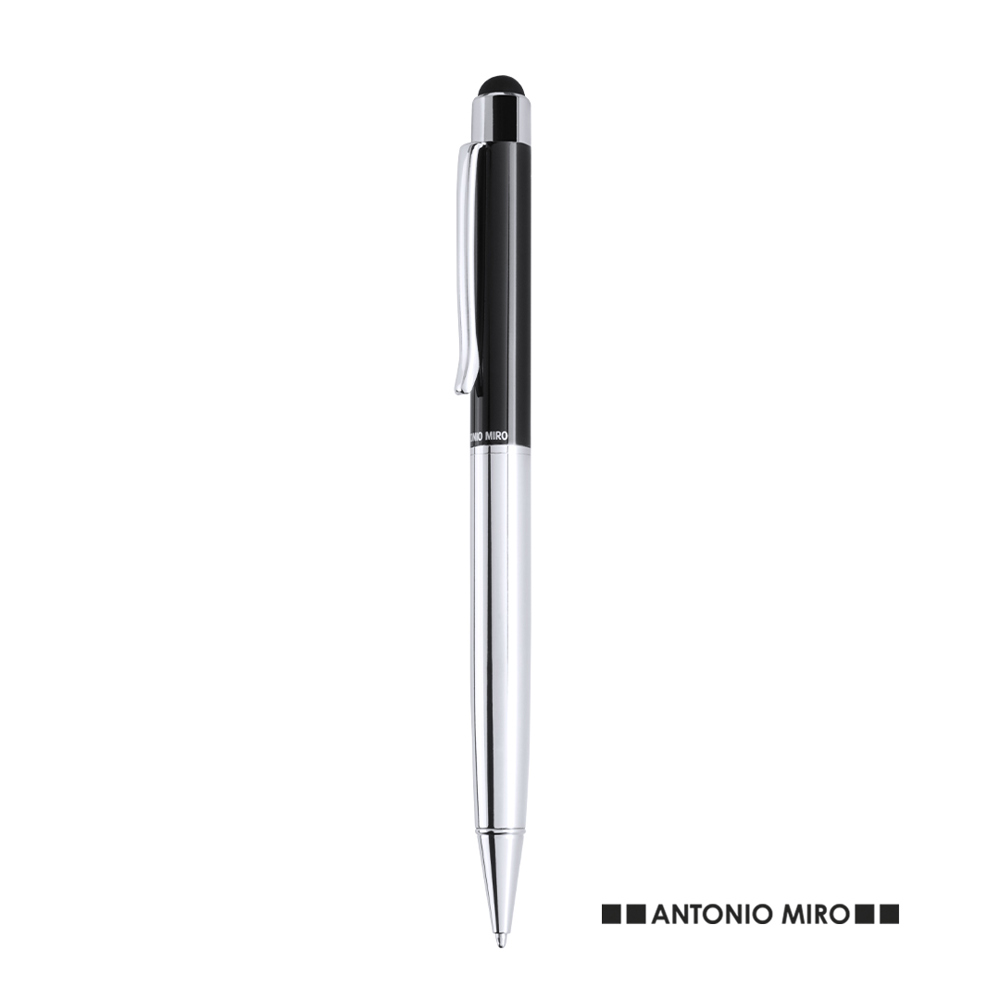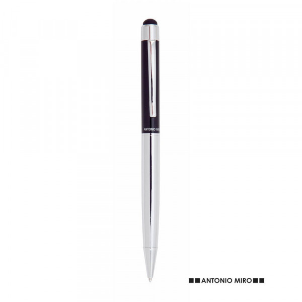 Stylus-balpen van Antonio Miró met draai-mechanisme en een zachte metalen body, elegante kleuren zilver en zwart. Clip en designpunt in bijpassende kleur. Gepresenteerd in een individuele, zwarte doos met het merklogo. Blauwe inkt.