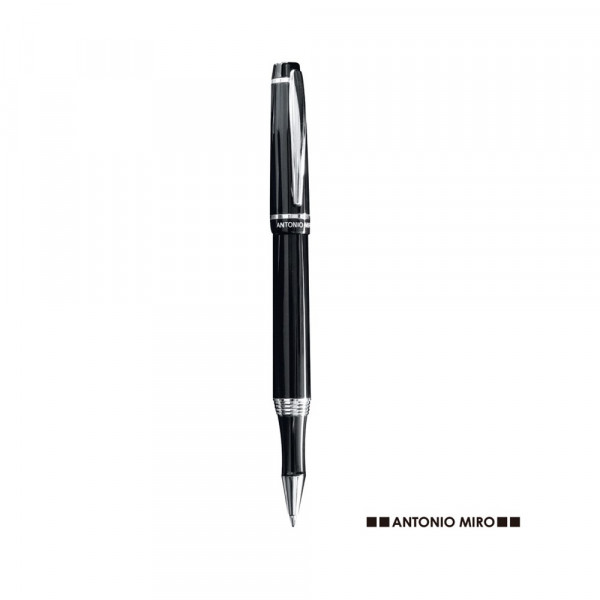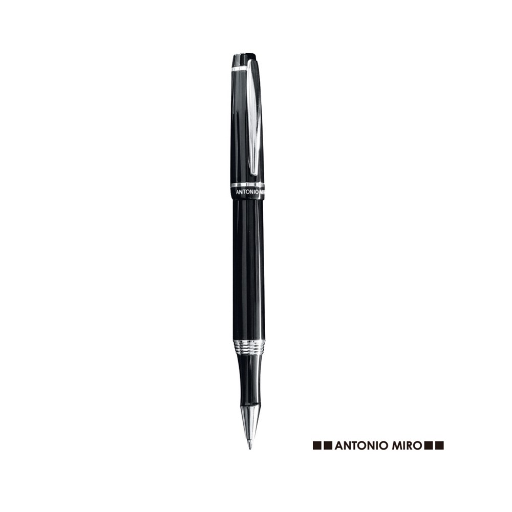 Balpen van Antonio Miró in een elegant tweekleurig design met zachte metalen body in sobere zwarte kleur. Met het merklogo onder de ring, en clip en punt in glanzend zilveren afwerking. Gepresenteerd in een individuele, zwarte doos met het merklogo. Blauwe inkt.