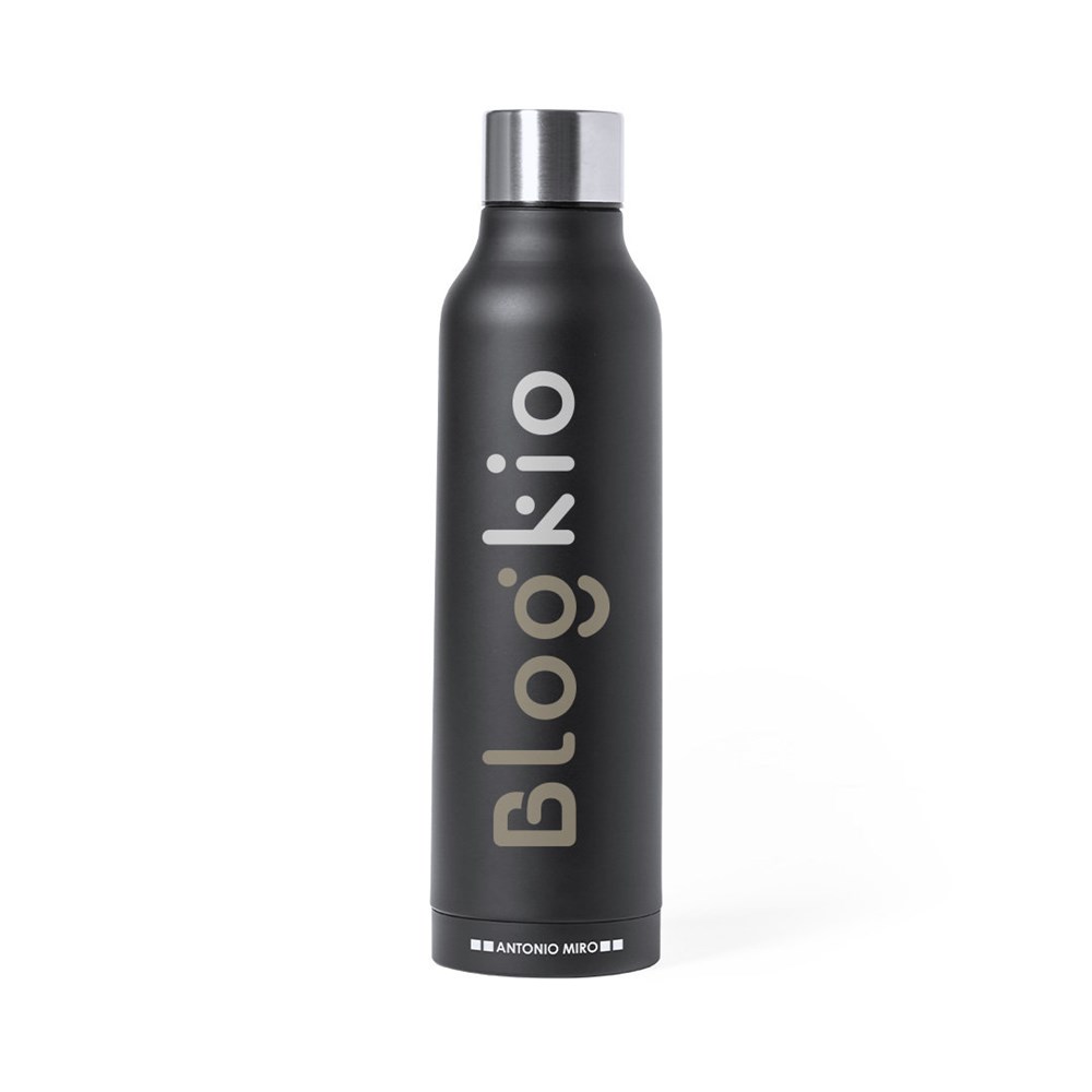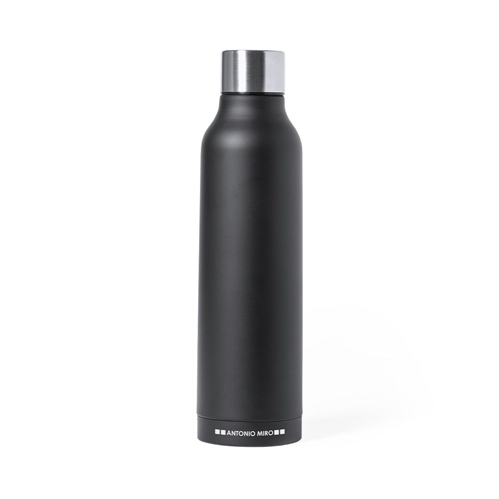 Thermische fles in roestvrij staal van Antonio Miró. Met een inhoud van 500ml en dubbelwandig voor een beter en duurzamer temperatuurbehoud. Met een sobere satijnzwarte afwerking, merklogo op de bodem en verchroomd schroefdeksel. Gepresenteerd in een aantrekkelijke ontwerpdoos met merklogo.