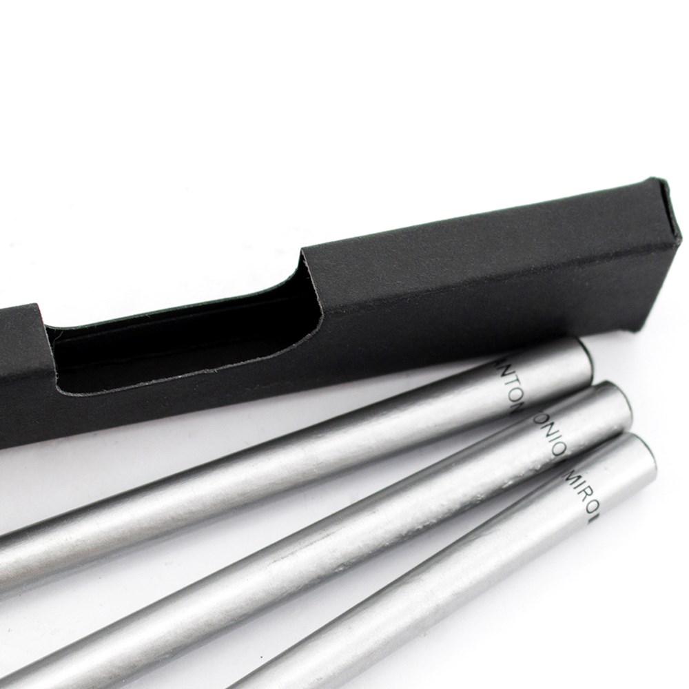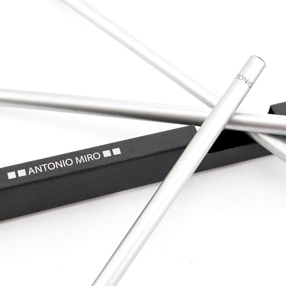 Set van 3 houten potloden van Antonio Miró met elegante, zilveren afwerking, met het merklogo op de top. Gepresenteerd in een elegante, zwarte kartonnen doos met venster en het merklogo.