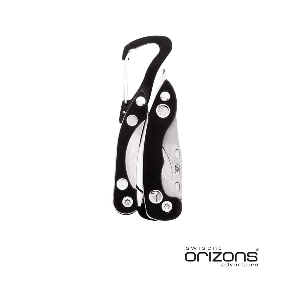 Multi-tool van Orizons met roestvrij stalen accessoires met 6 functies en aluminium handvat in diverse kleuren. Met tang, scheermes, blikopener met platte- en kruiskopschroevendraaier met flesopenerfunctie en karabijnhaak. Gepresenteerd in een aantrekkelijke designdoos met het merklogo.