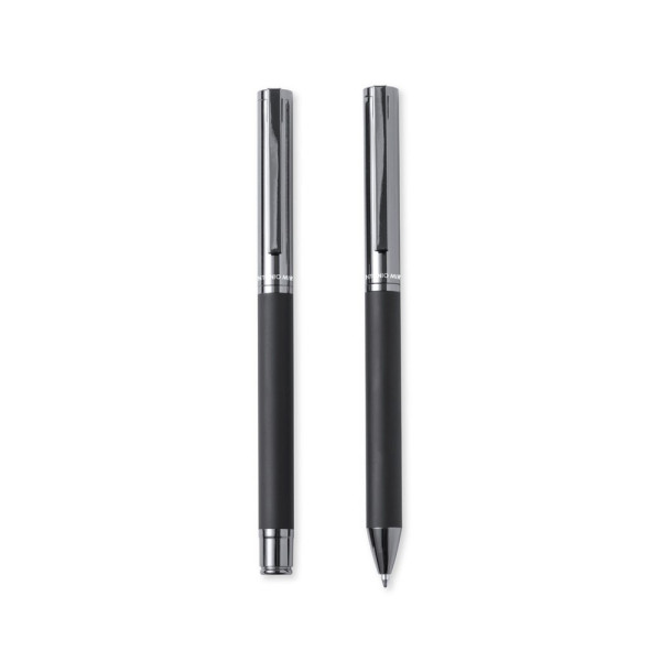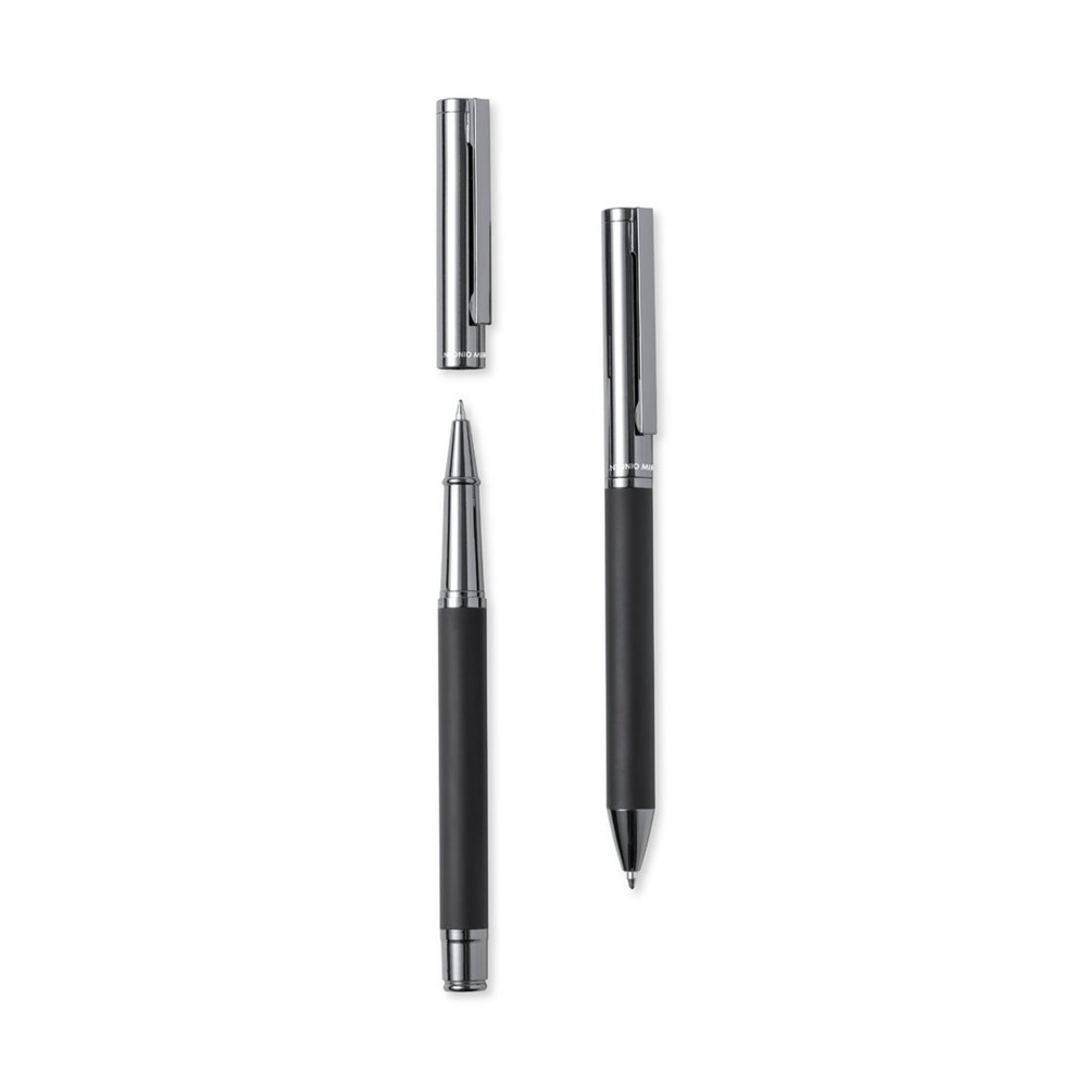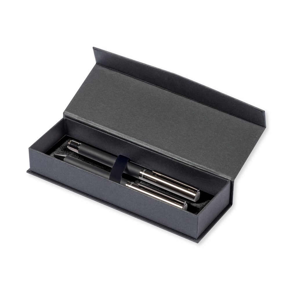 Antonio Miró balpen en rollerpen set. Inclusief:Metalen balpen met matzwarte houder. Verchroomde fittingen en dop met merklogo. Jumbo cartridge en blauwe inkt.Metalen rollerpen met matzwarte houder. Verchroomde fittingen en dop met merklogo. Jumbo cartridge en blauwe inkt.Gepresenteerd in een elegante en resistente individuele zwarte behuizing met Antonio Miro-logo. Magnetische sluiting en bijpassende beschermhoes.