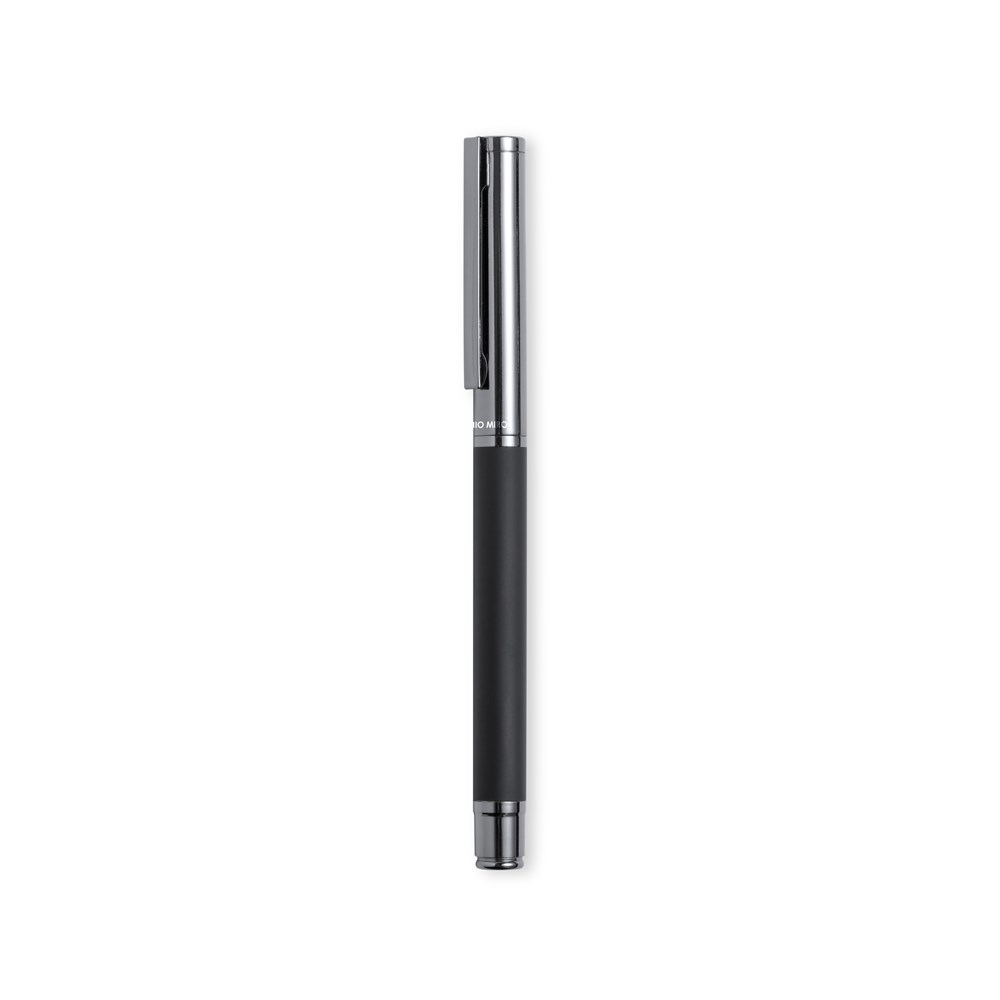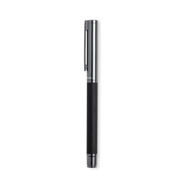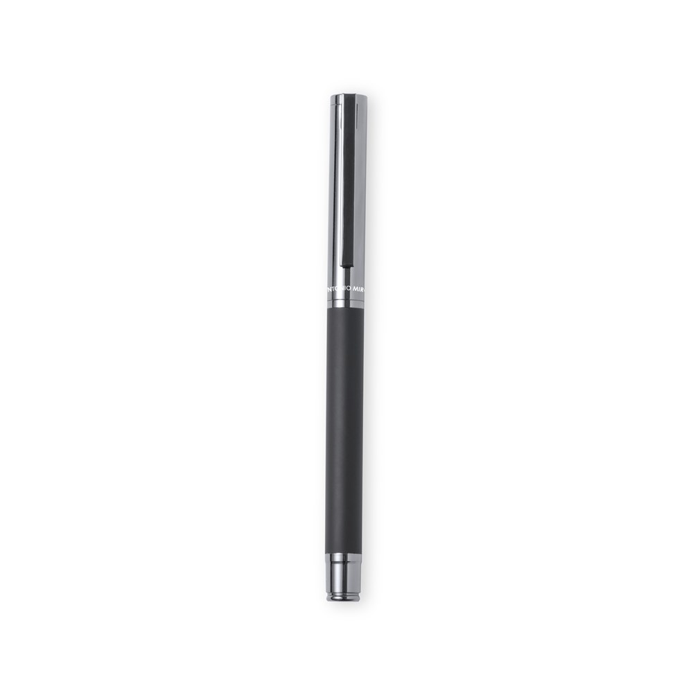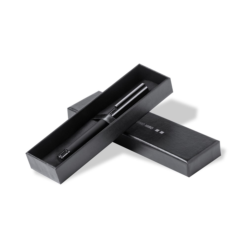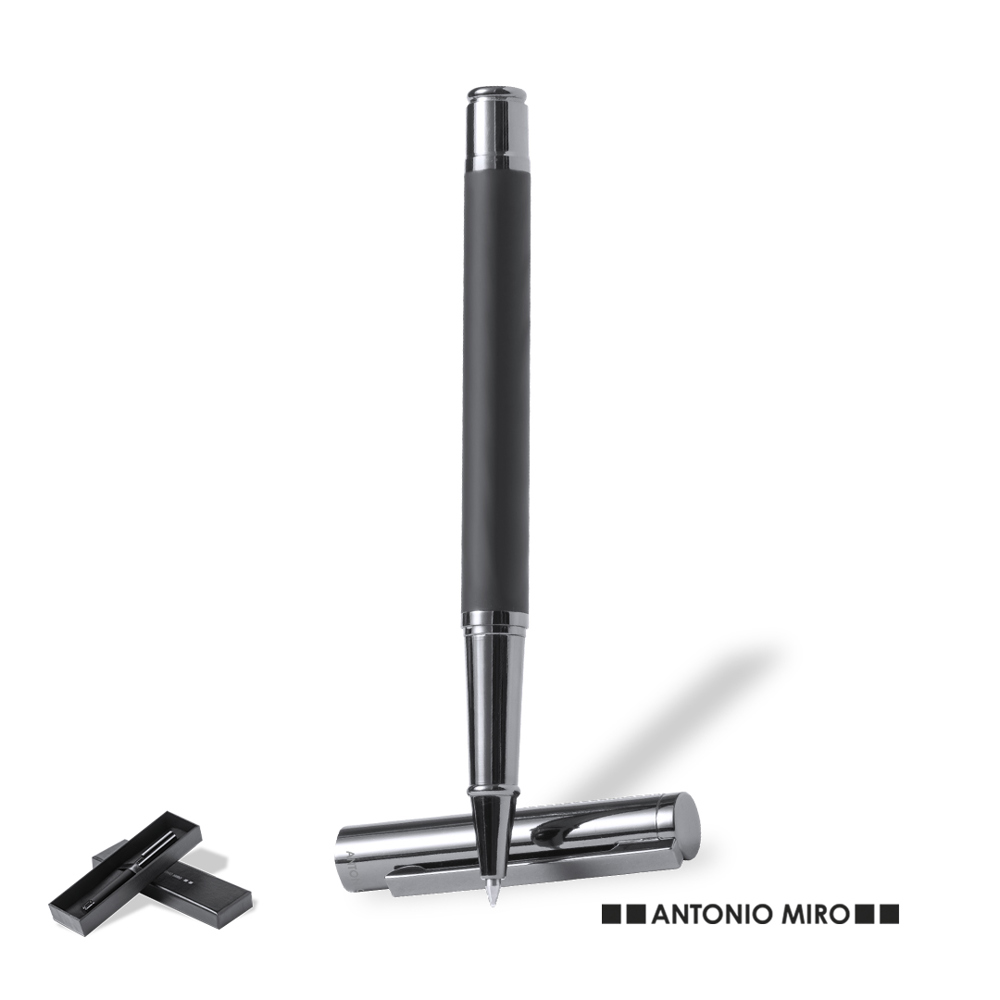 Antonio Miró rollerpen van metaal, met matzwarte houder. Verchroomde fittingen en dop met het logo van het merk. Jumbo cartridge en blauwe inkt. Gepresenteerd in een elegante en resistente zwarte individuele doos met Antonio Miró-logo en bijpassende hoes.