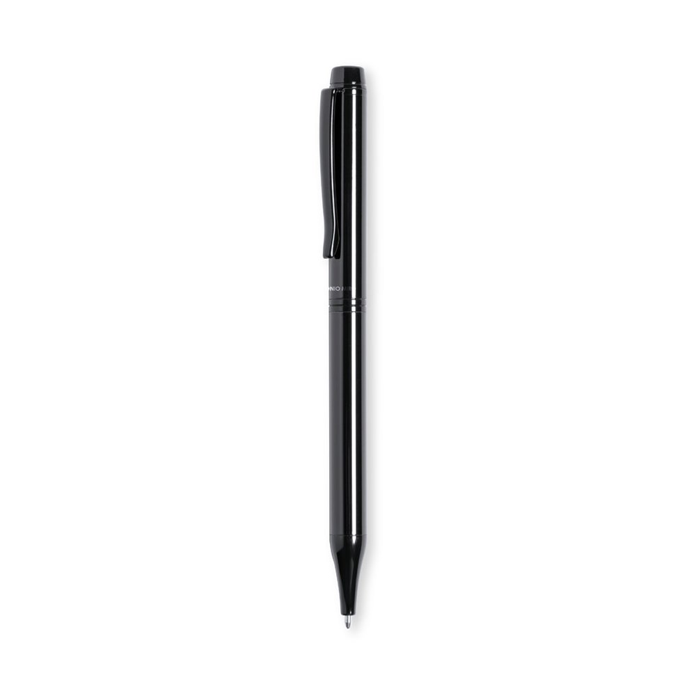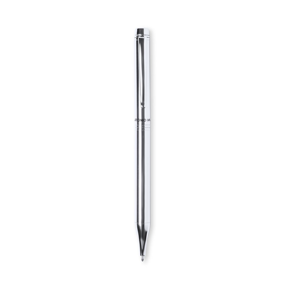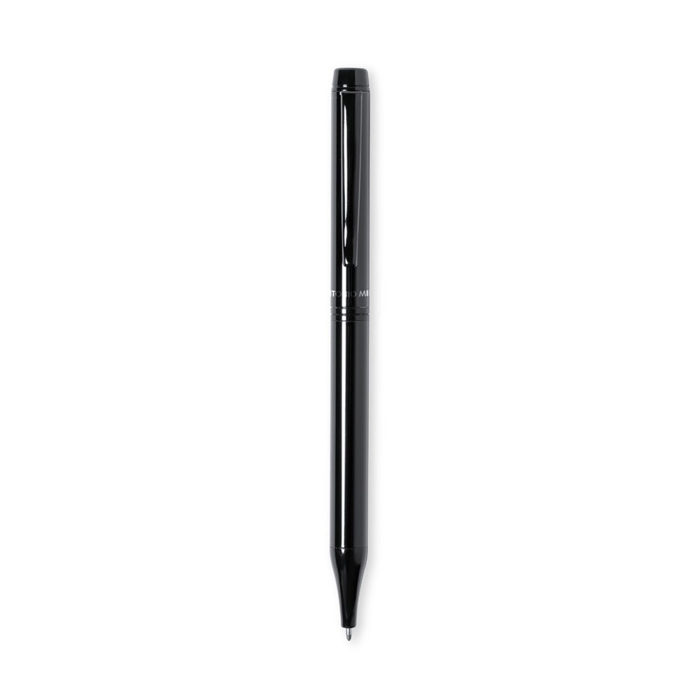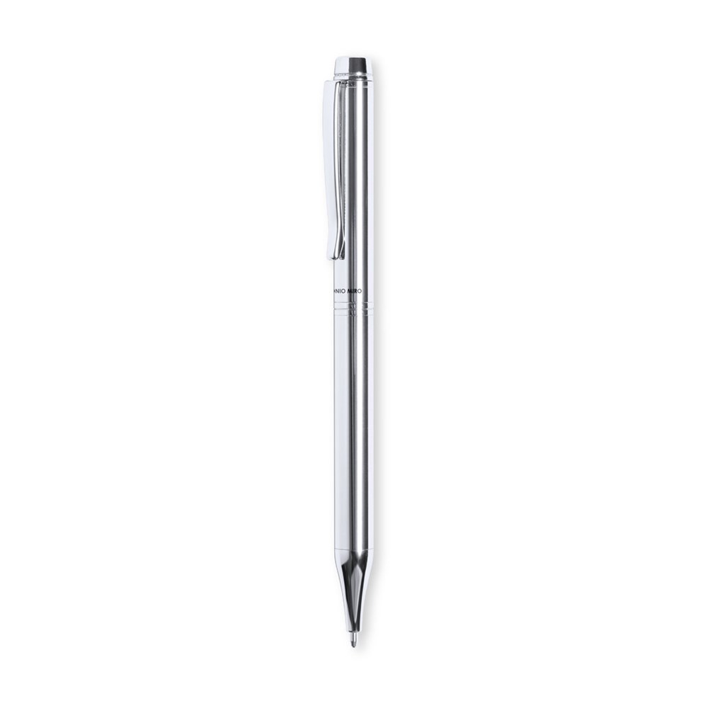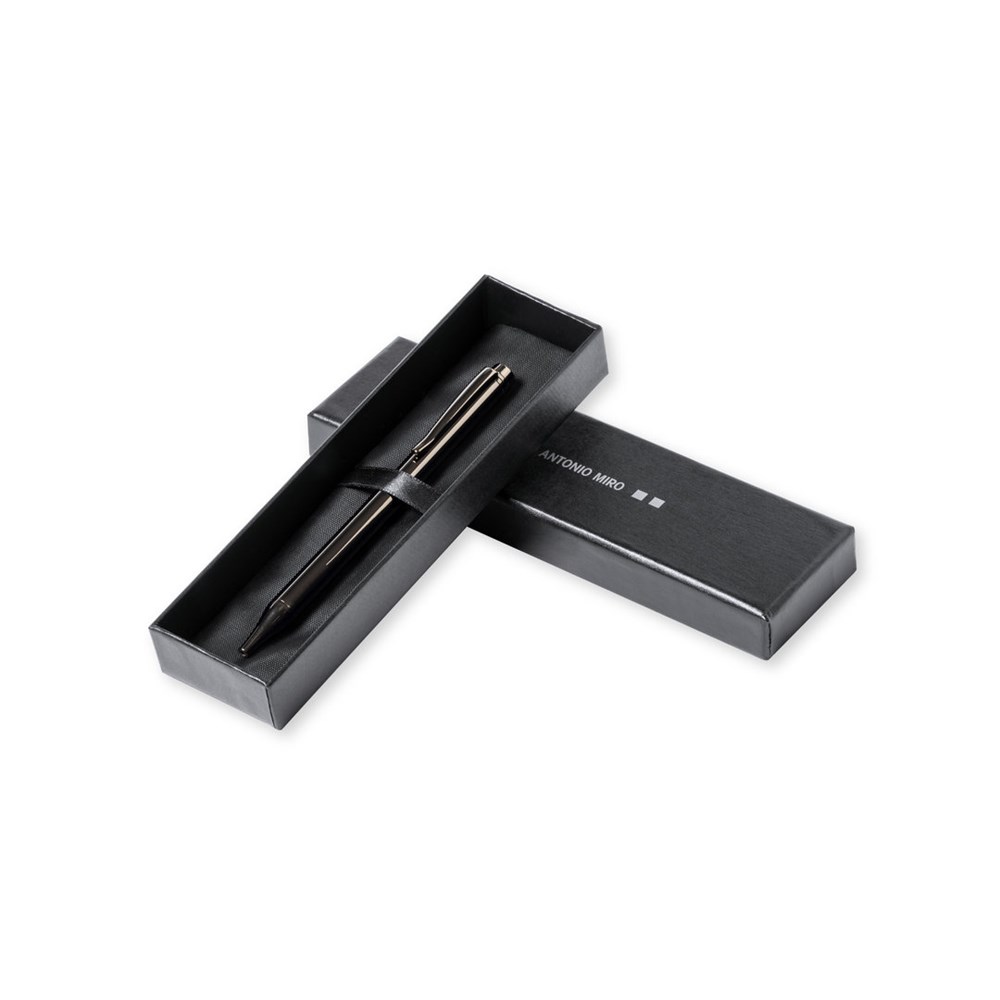 Antonio Miró balpen gemaakt van glanzend metaal, met merklogo op de houder en verkrijgbaar in een breed scala aan kleuren. Met draaimechanisme en in blauwschrijvend. Gepresenteerd in een elegante en resistente zwarte individuele doos met Antonio Miró-logo en bijpassende hoes.
