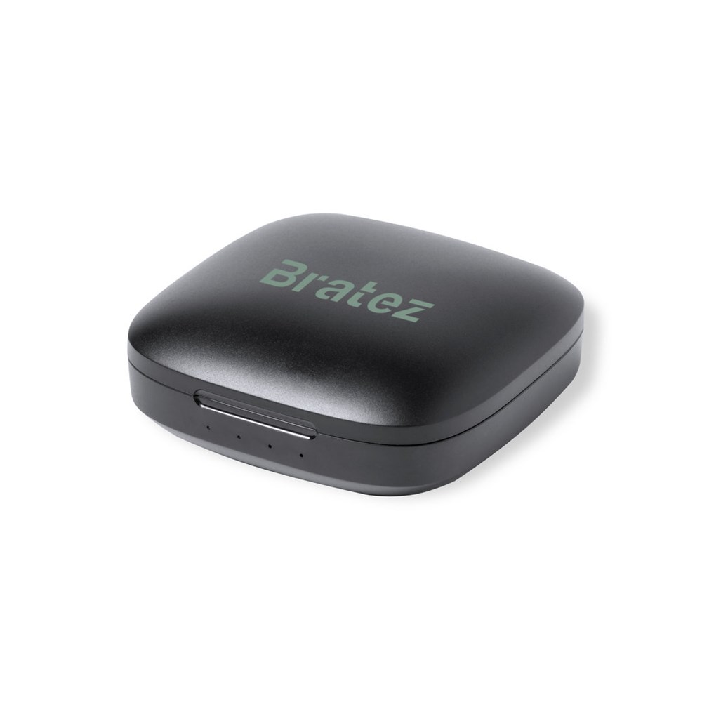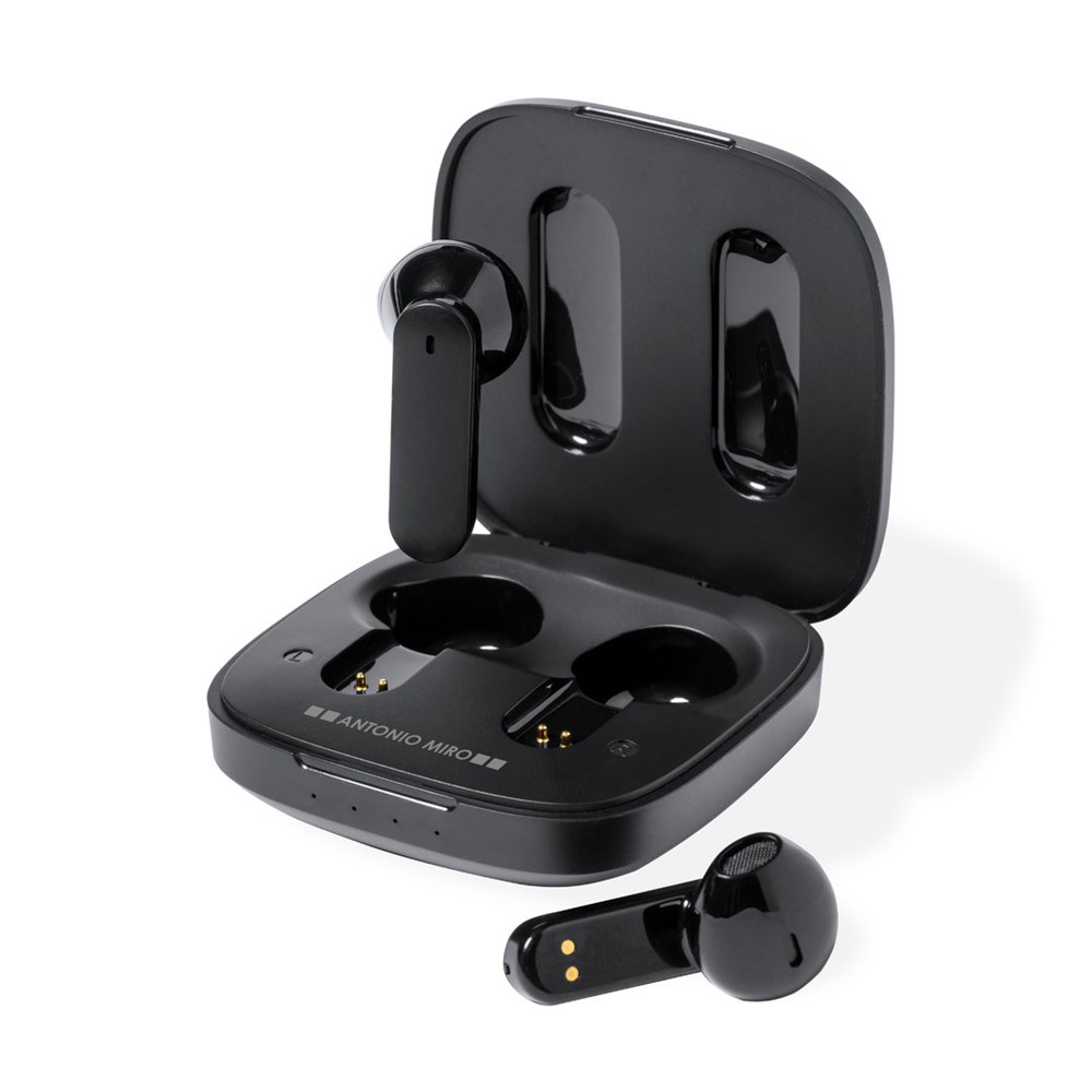 Antonio Miró Bluetooth-oortjes in een elegante matte afwerking in zwart. Bluetooth® 5.0 verbinding, met geïntegreerde 30 mAh lithium batterij in elke oortelefoon. Ergonomisch ontwerp, met touch control knop op het oorstuk en handsfree functie. Bijpassende oplaadbasis met 300 mAh capaciteit en LED-laadstatusindicator. Bijpassende Type C oplaadkabel inbegrepen en gepresenteerd in een individuele zwarte doos met Antonio Miro logo. Gebruiksaanwijzing in het Engels en Spaans.