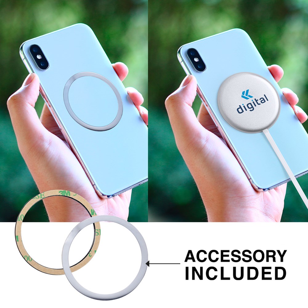 Magnetische draadloze oplader van 10 W. Behuizing van duurzaam aluminium met zilveren afwerking. Oplaadstatusindicator en USB-kabel van 1 m met aluminium connector. Inclusief metalen accessoire met 3M lijm, extra sterke bevestiging en vrij van resten wanneer losgekoppeld van het apparaat, waardoor het gebruik van de magnetische functie van de lader op elk mobiel apparaat mogelijk is. Compatibel met apparaten die zijn uitgerust met draadloze oplaadtechnologie. Groot drukoppervlak en gepresenteerd in een aantrekkelijke ontwerpdoos. Gebruiksaanwijzing beschikbaar in het Engels en Spaans.