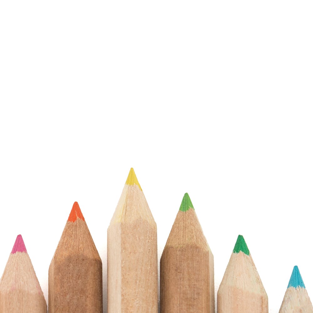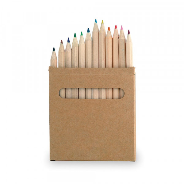 Set van 12 potloden in een kartonnen doos met venster in natuurlijke kleur. Houten potloden met zeshoekig lichaam in natuurlijke afwerking en in verschillende kleuren.