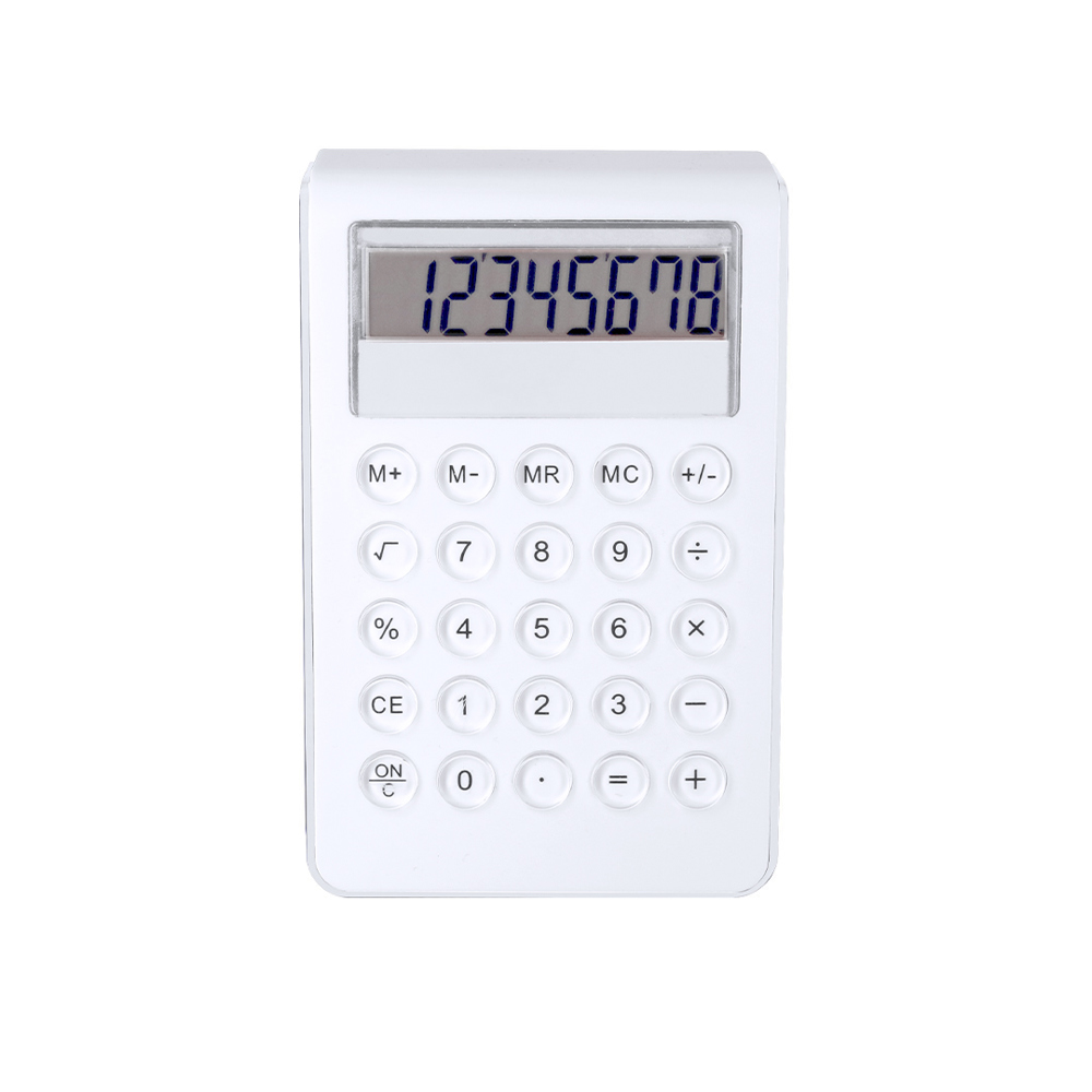 8-cijferige rekenmachine in een origineel, tweekleurig ontwerp in levendige kleuren en zachte, transparante toetsen. Knoopcelbatterij wordt meegeleverd met beschermfolie en gepresenteerd in een individuele doos.