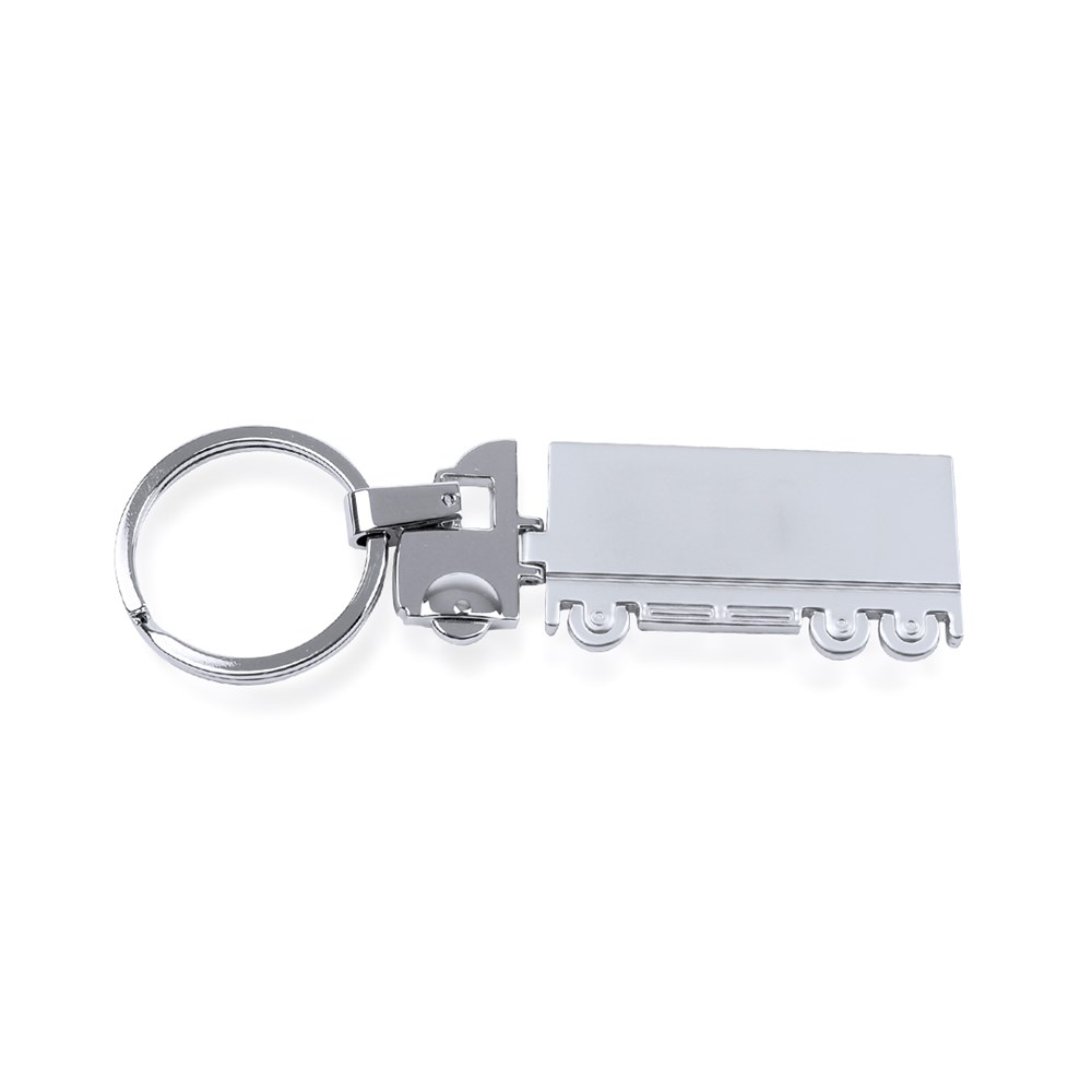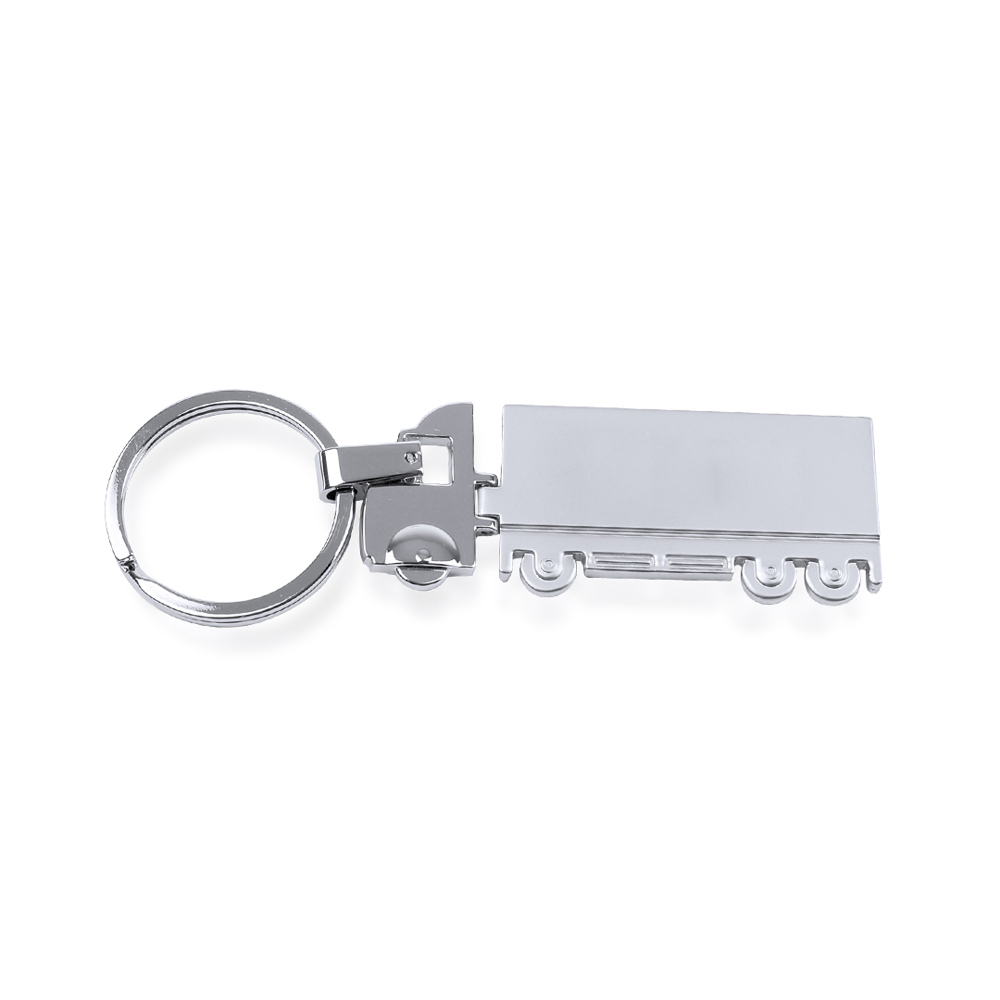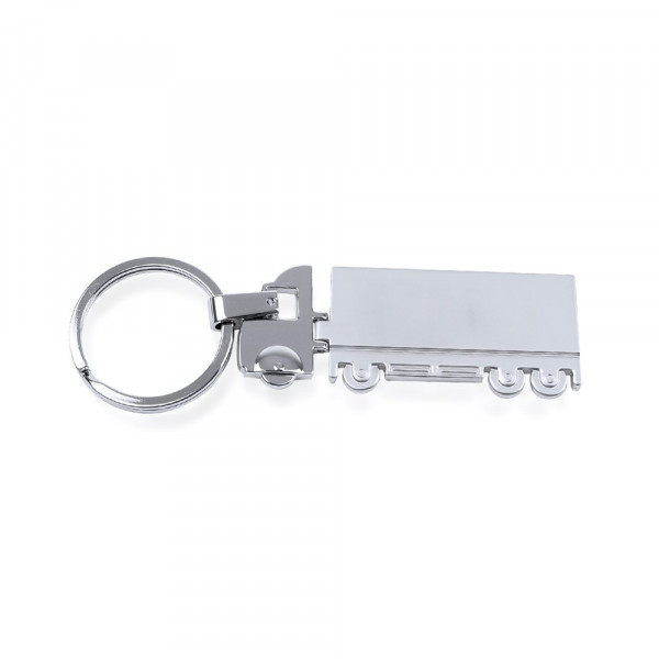 Metalen sleutelhanger in het ontwerp van een truck, speciaal ontworpen voor laserafdrukken. Met cabine in glanzende afwerking en aanhanger met matte afwerking.