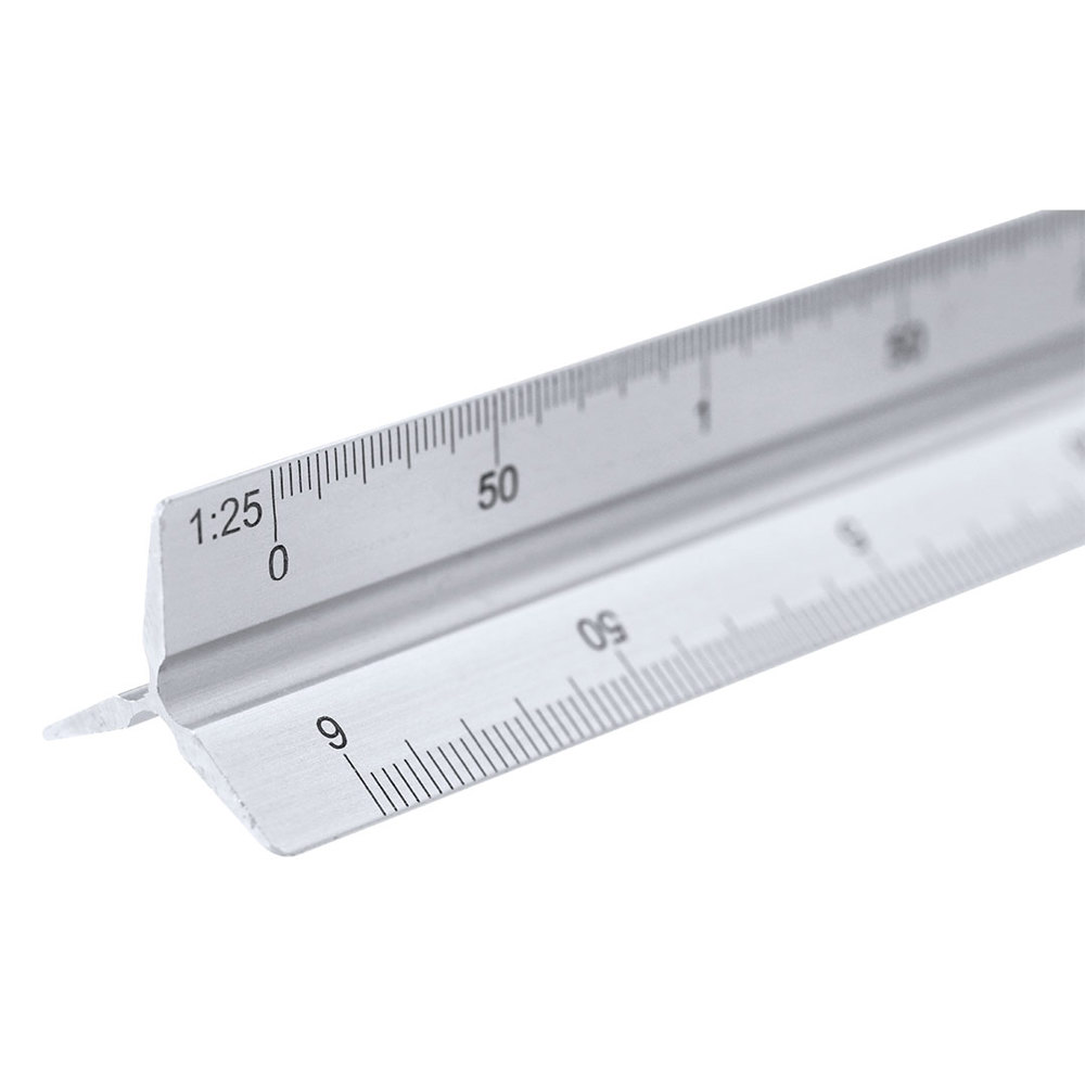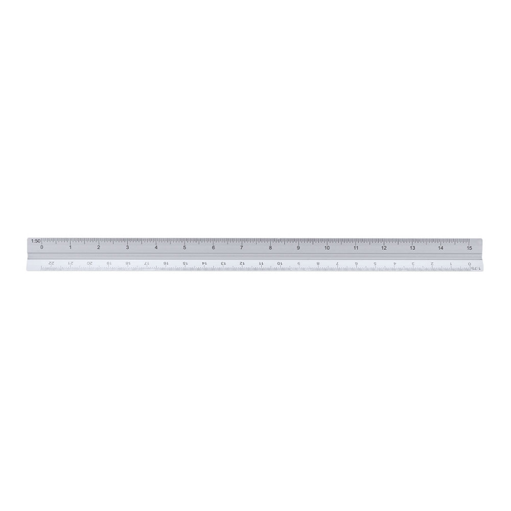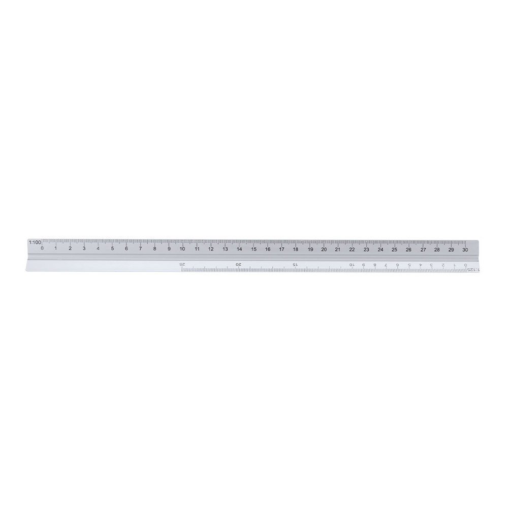 30cm driehoekige aluminium liniaal. Schalen 1: 20/1: 25/1: 50/1: 75/1: 100. Glad oppervlak voor bedrukken. Gepresenteerd in een individuele doos.