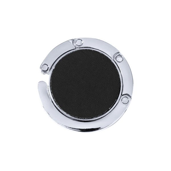 Opvouwbare metalen tashanger met lederen PU vlak in diverse kleuren. Gepresenteerd in een individuele doos met gestanste binnenkant.