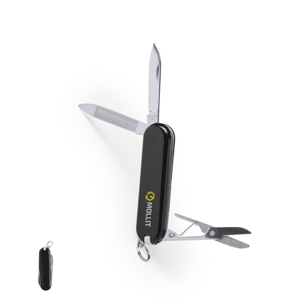 Multifunctioneel mini-mes met roestvrij stalen accessoires, 6 functies in gevarieerde kleuren. Omvat mes, tang, vijl, tandenstoker, sleutelhanger en schaar. Gepresenteerd in een individuele doos.
