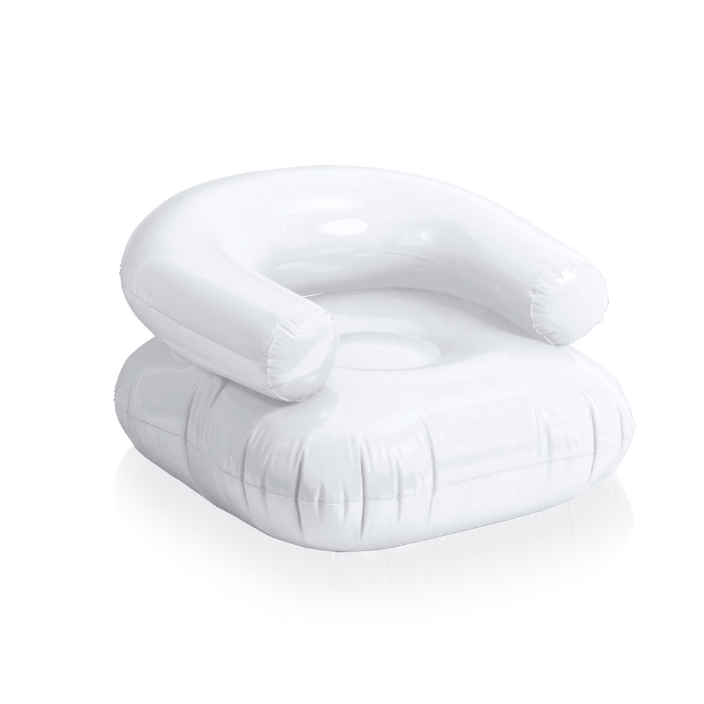 Opblaasbare PVC-fauteuil met comfortabele rugleuning en versterkt zitvlak in diverse kleuren. Op speciale manier gevouwen voor eenvoudig printen.