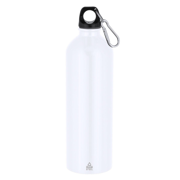 800 ml bidon van gerecycled roestvrij staal met metallic afwerking. Zwarte schroefdop voor een optimale afsluiting. Inclusief metalen karabijnhaak die het transport vergemakkelijkt. Met embleem van gerecycled roestvrij staal. Staal is een van de meest gevraagde materialen en komt bijna overal voor, van alledaagse producten tot grote constructies. Met talloze eigenschappen, waaronder duurzaamheid en een hoog hergebruikniveau, is het een zeer gewaardeerd alternatief in duurzame oplossingen. Bij correcte behandeling levert het nieuwe middelen op voor oneindig gebruik.