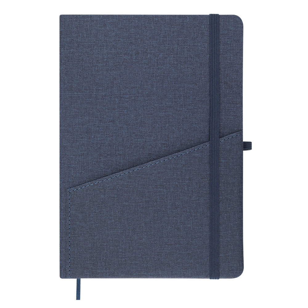 Notitieboek met harde kaft van gerecycled PU met linnen afwerking. Met praktisch voorvak, pennenhouder, bijpassend leeslint en elastische sluitband. Bevat 80 crèmekleurige gelinieerde bladen. Met gerecycled PU-embleem. Gerecycled PU onderscheidt zich door zijn sterkte en elasticiteit. Dit gerecyclede en recyclebare materiaal is een duurzame optie die afgekeurde vezels uit productieprocessen hergebruikt, waardoor materiaalverspilling wordt geminimaliseerd en de milieu-impact wordt verminderd, terwijl het toch zijn oorspronkelijke eigenschappen behoudt.