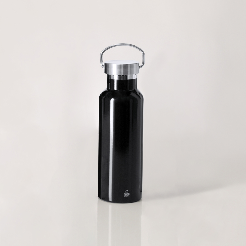 Isolerende fles gemaakt van dubbelwandig gerecycled roestvrij staal met een capaciteit van 500 ml. Afgewerkt in levendige kleuren met metallic effect. Schroefdop met draaghendel. Met embleem van gerecycled roestvrij staal. Staal is een van de meest gevraagde materialen en is vrijwel overal te vinden, van alledaagse producten tot grote constructies. Met talloze eigenschappen, waarvan duurzaamheid en een hoge mate van herbruikbaarheid de belangrijkste zijn, is het een zeer gewaardeerd alternatief in duurzaamheidsoplossingen. Bij correcte verwerking maakt het de creatie van nieuwe, eindeloos bruikbare grondstoffen mogelijk.