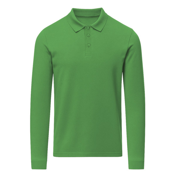 Unisex poloshirt met lange mouwen, gemaakt van piquéstof. Kraag en boorden in 1x1 rib met elastaan voor betere pasvorm en comfort. Sluiting met drie knopen in bijpassende kleur en verstevigde nektape.