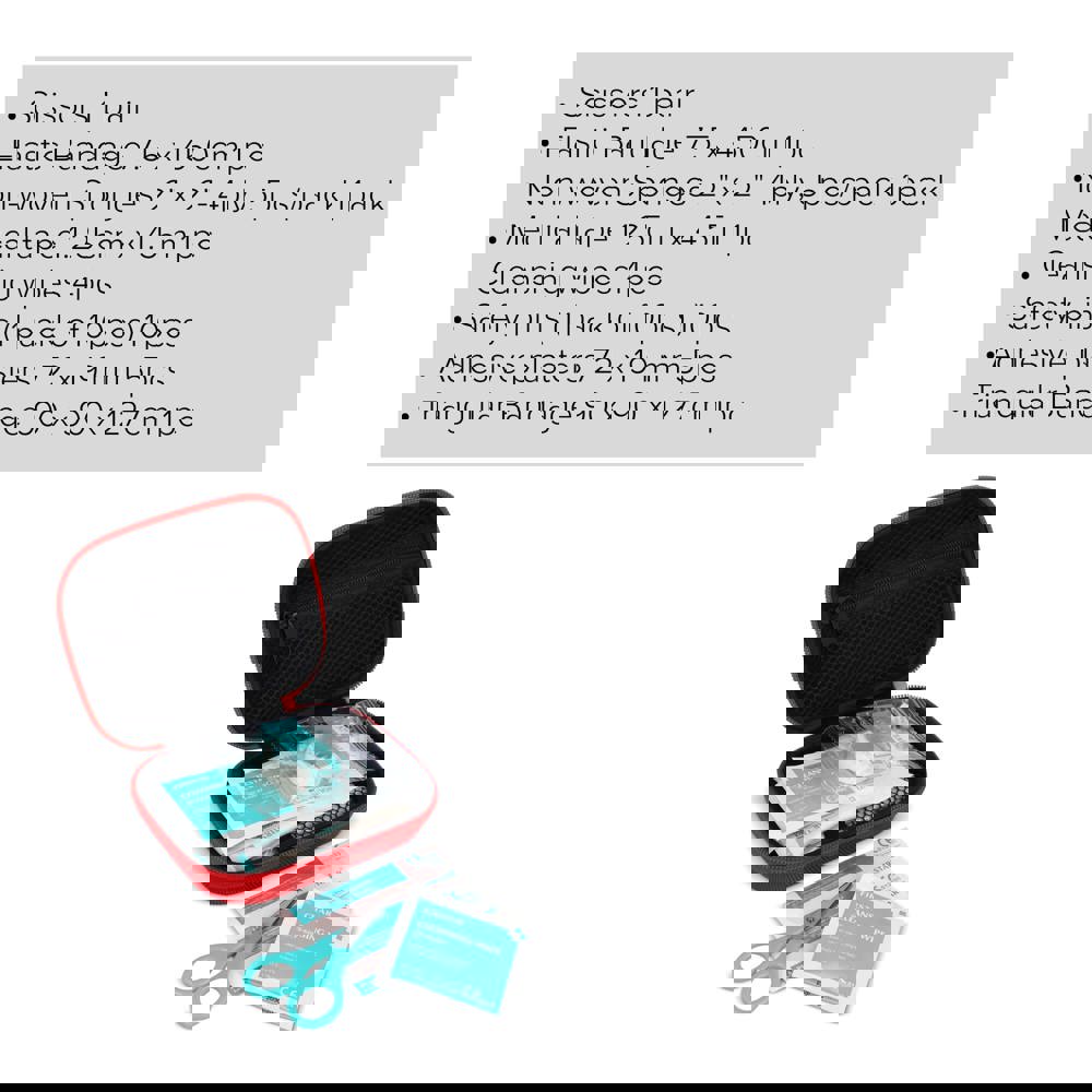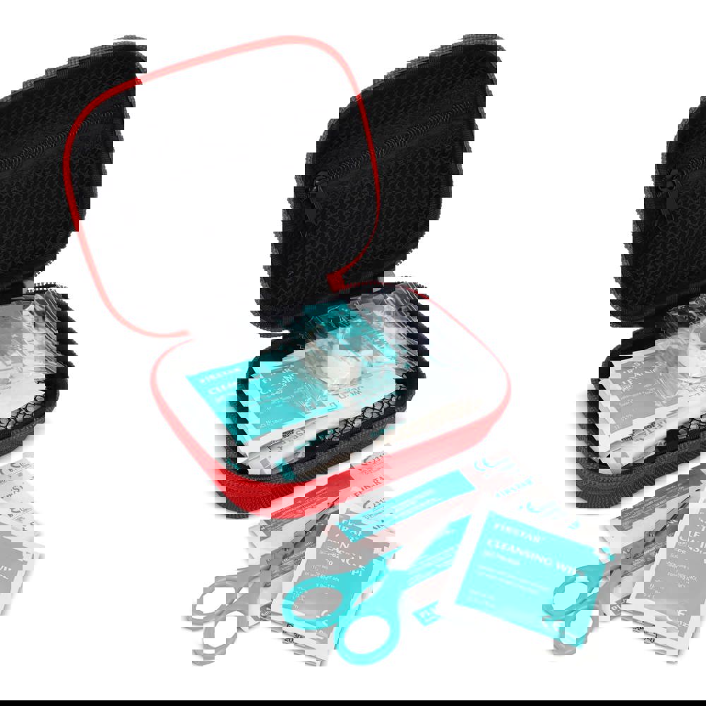 Deze EHBO set zit in een stevige EVA-etui en voldoet aan Europese normen voor EHBO-materialen. Ideaal voor thuis, op kantoor, in de auto of bij outdoor-activiteiten. Compact en praktisch, met essentiële items voor het behandelen van kleine verwondingen, snijwonden of verstuikingen tot professionele hulp beschikbaar is. Inhoud: 1 × schaar, 1 × elastisch crepeverband 7.5 × 450 cm, 1 × wondverband 2" × 2" 4-laags (5 stuks), 1 × medische tape 1.25 cm × 4.5 m, 4 × reinigingsdoekjes, 1 × veiligheidsspelden (10 stuks), 5 × pleisters 72 × 19 mm PE, 1 × driekantverband 90 × 90 × 127 cm.