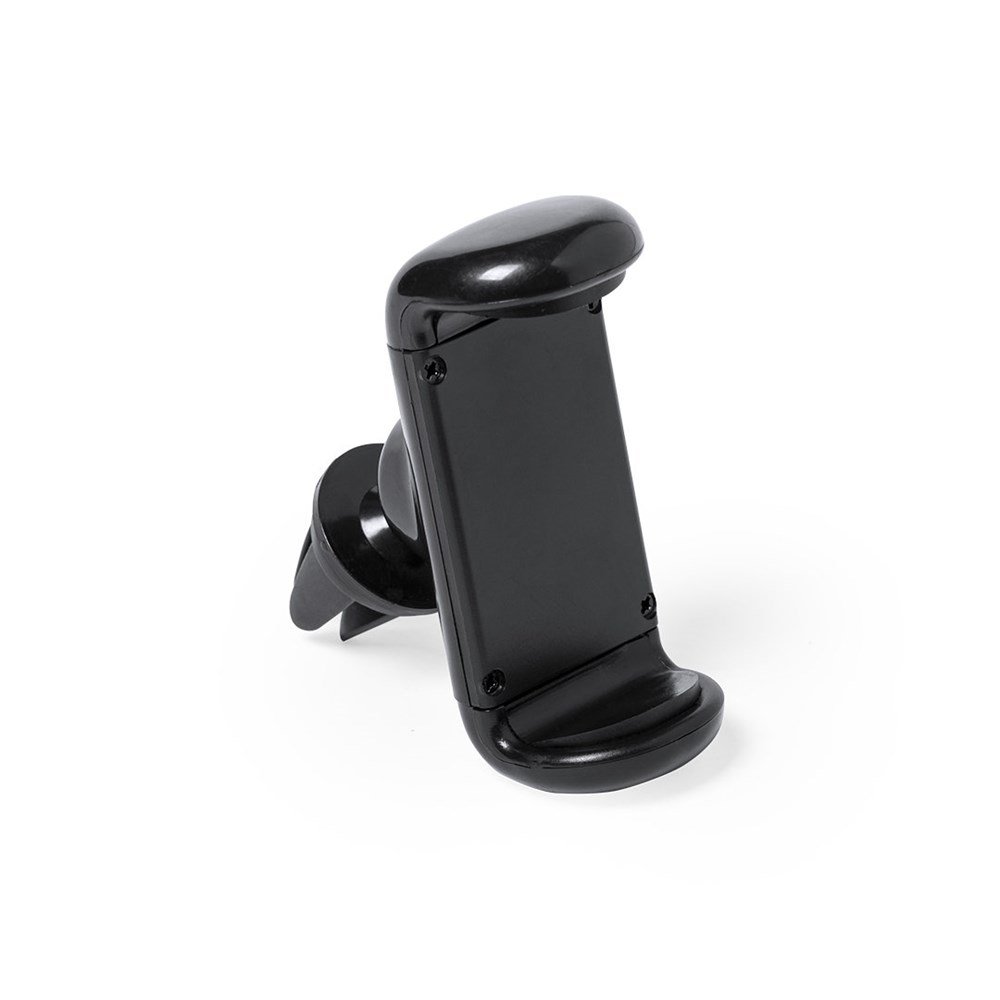 Verstelbare smartphonehouder met een minimalistisch design, 360º draaibare voet en elegante zwarte afwerking. Met bevestigingssysteem voor het ventilatierooster van de auto en breed markeeroppervlak, speciaal ontworpen voor tampondruk.