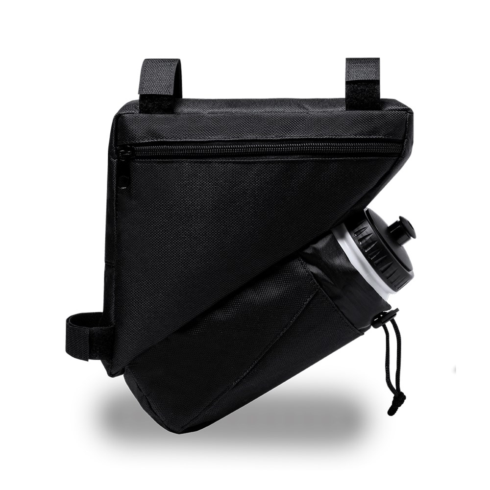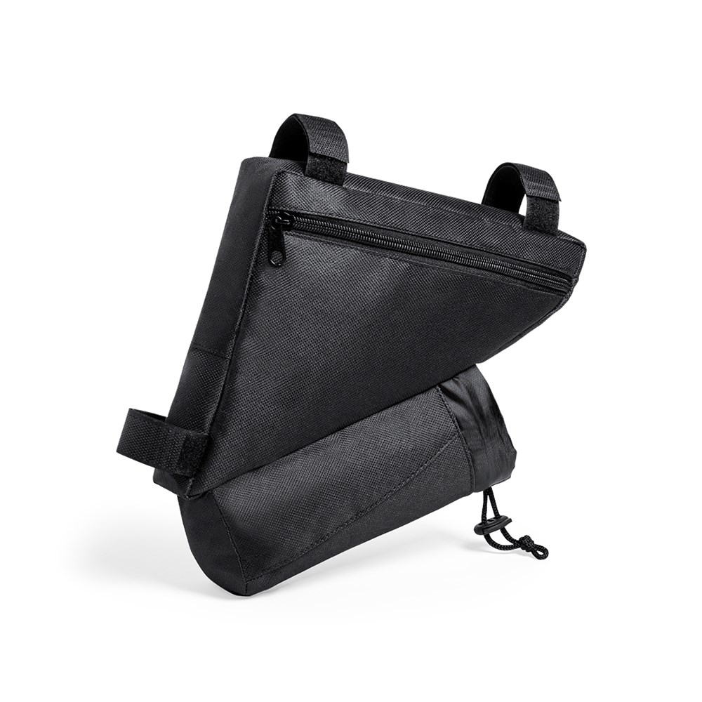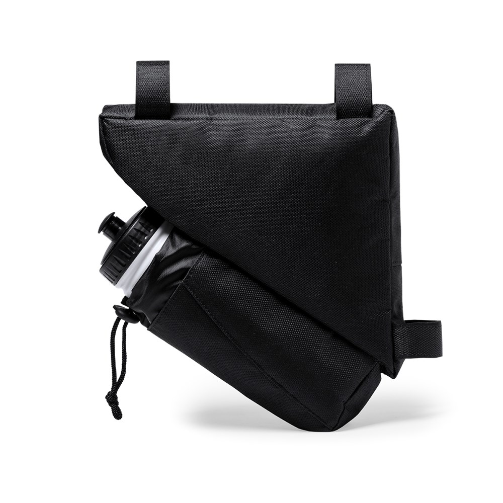 Fietstas van bestendig 600D polyester met versterkte PVC binnenkant. Verkrijgbaar in zwarte kleur. Hoofdvak met ritssluiting en universele aanpassing aan het fietsframe door middel van 3 klittenbandstrips. Vak voor waterfles met verstelbaar koord.