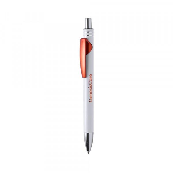 Balpen met klik mechanisme, aluminium behuizing in witte effen kleur en bovenste ring in een breed scala van heldere, metallic kleuren. Clip met een breed drukoppervlak. Speciaal ontworpen voor lasergravure, inclusief een speciale coating voor uw logo. Voorzien van een blauwe vulling.