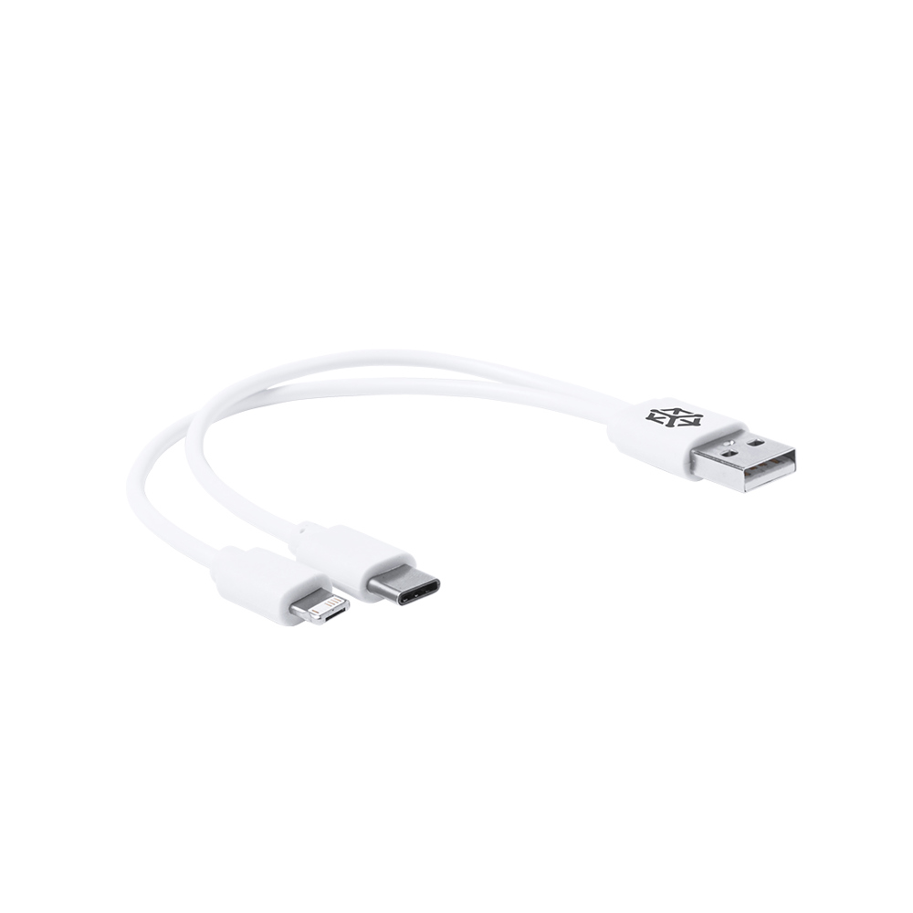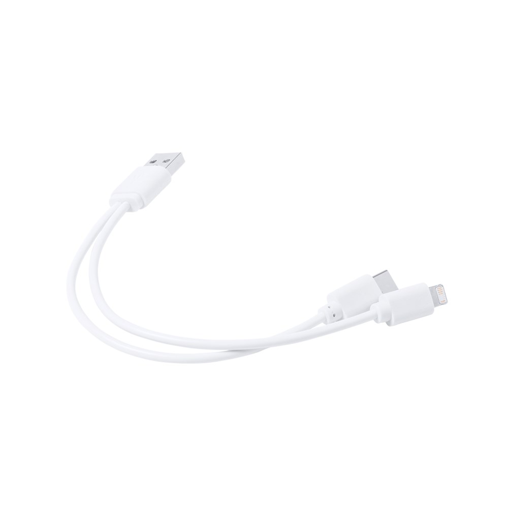 USB-oplaadkabel met C-type en dubbele micro USB / Lightning-verbindingen. In witte kleur.