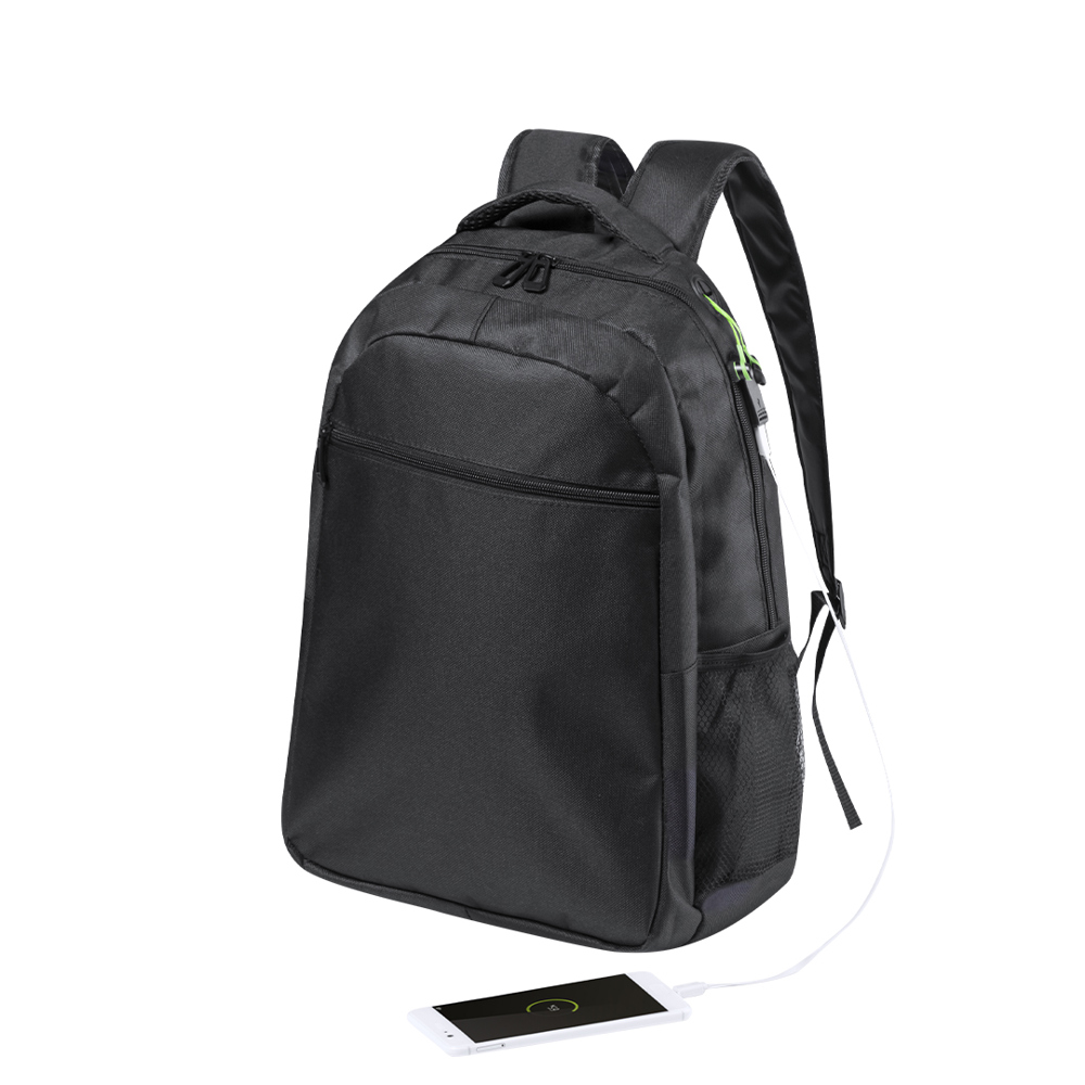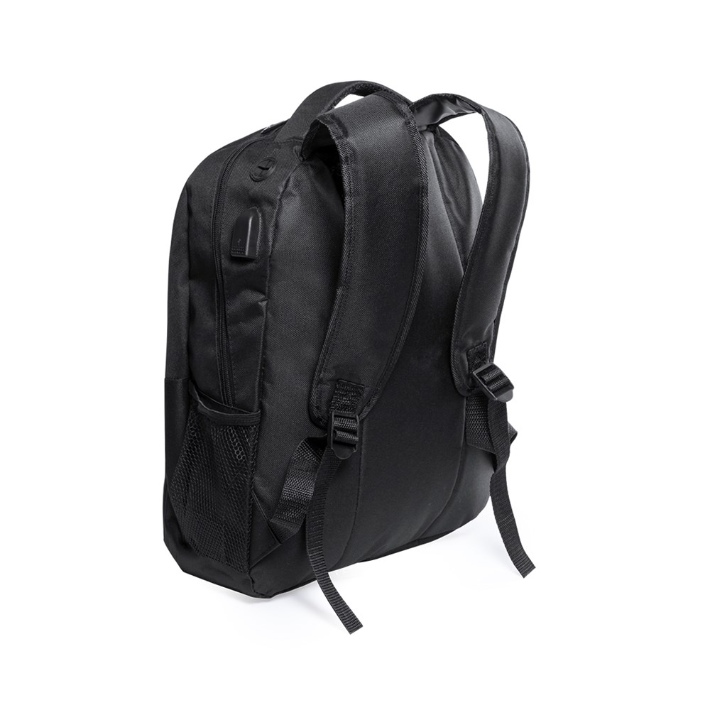 Stevige 600D polyester rugzak met stijlvolle, zwarte, waterdichte, afwerking, met hoofdtelefoonuitgang. Binnenvak met USB-poort voor powerbank-aansluiting (niet inbegrepen). Binnenkant met gevoerd vak voor laptops tot 15 inch en binnen- en buitenzakken. Schouder- en rugbanden met ergonomische vulling.