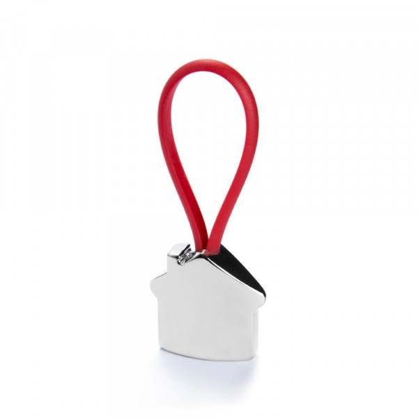 Metalen sleutelhanger in 3D-huisontwerp. Met rubberen band in gevarieerde kleuren.