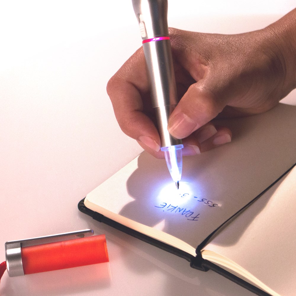 Balpen met ingebouwde LED-zaklamp. Origineel tweekleurig ontwerp en body van glad, zilveren afwerking. In verschillende kleuren met band en klem in bijpassende kleur. In blauwe inkt met knoopcelbatterijen inbegrepen.