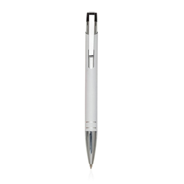 Originele push-up balpen in een elegant tweekleurig ontwerp. Met gestanste aluminium behuizing in glad aluminium, in gevarieerde kleuren. Originele gebogen clip, ringen en tip in zilver. Jumbo inktpatroon en blauwe inkt.