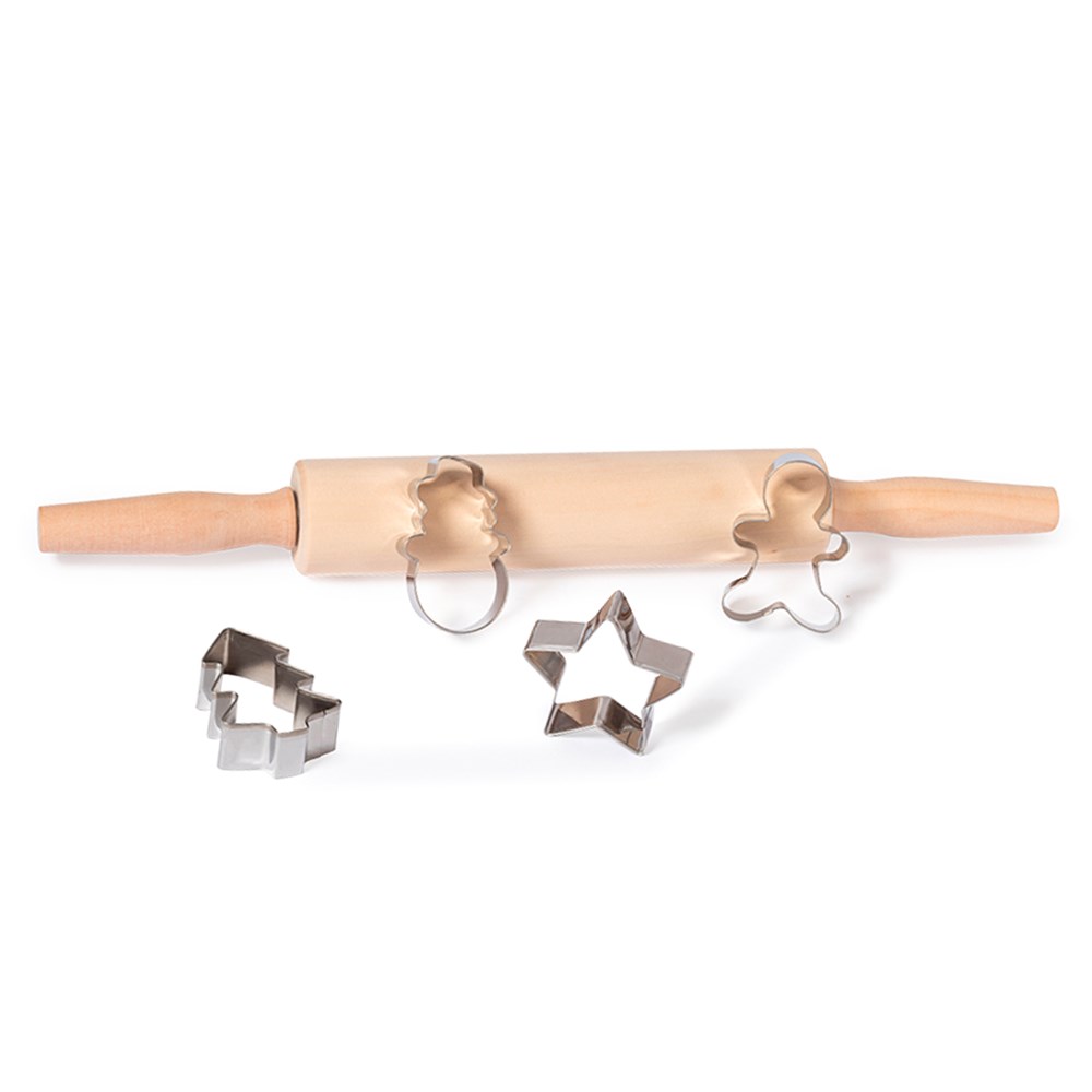 Kerstbakkersset. Inclusief vormen van roestvrij staal en deegroller van duurzaam natuurlijk hout. Inclusief deegroller en 4 vormen in de vorm van kerstboom, ster, sneeuwpop en peperkoekman. Gepresenteerd in een kraft doosje.