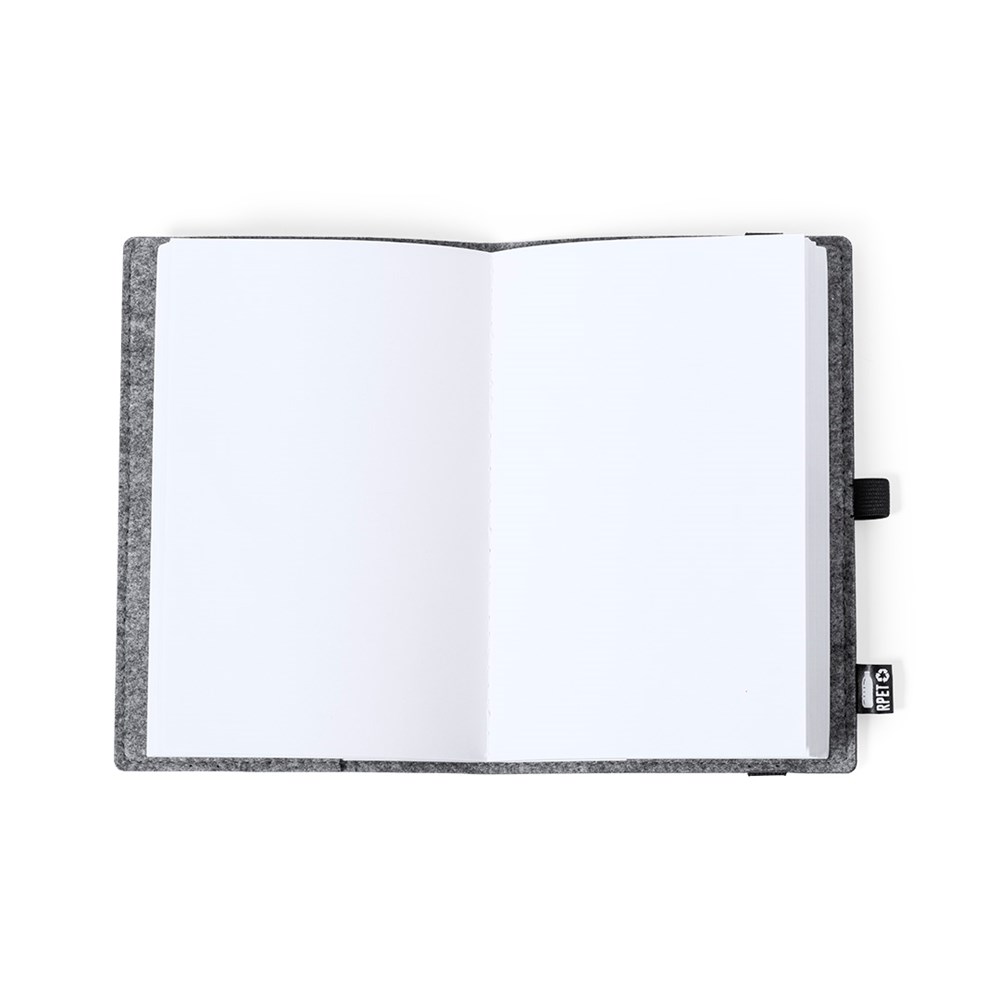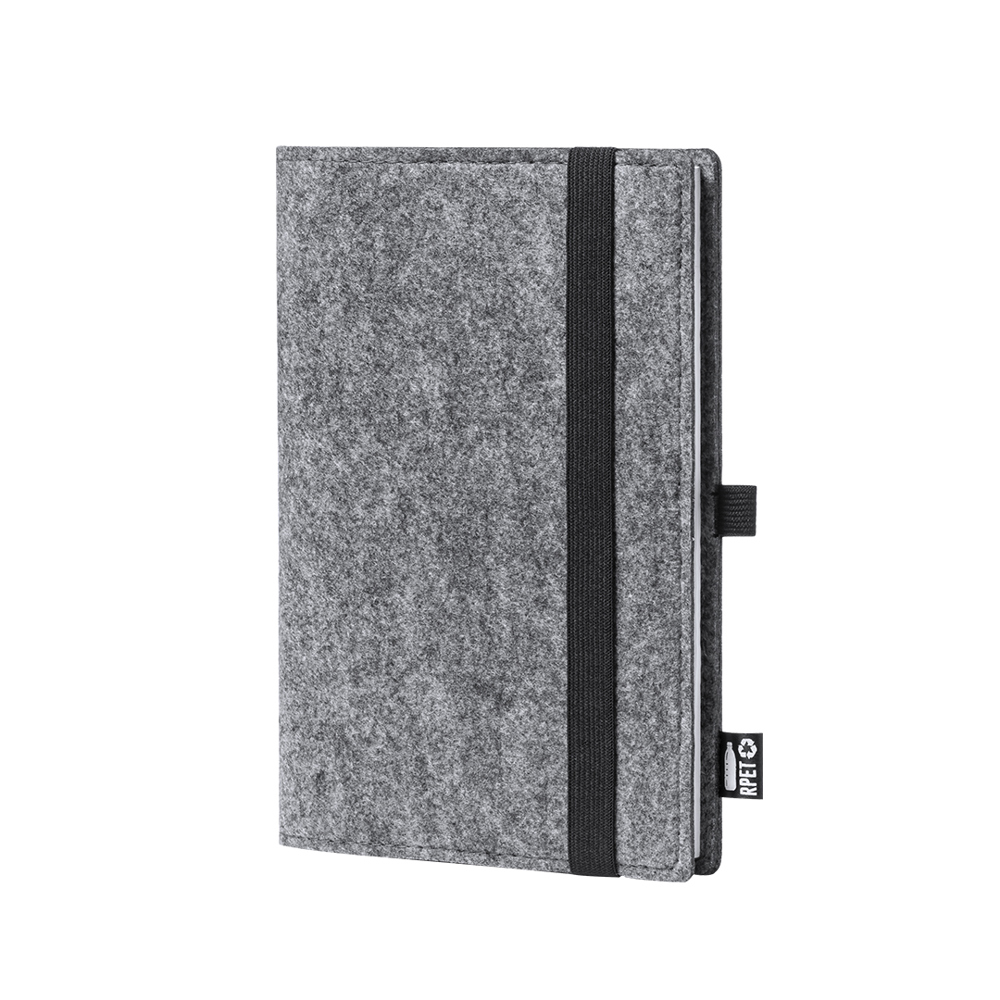A5 notitieblok in natuurlijn met RPET gerecycled vilten omslag. Het resultaat van de combinatie van de recyclageprocessen van plastic materialen samen met de duizendjarige techniek van viltproductie, wat resulteert in een eco-trendmateriaal dat niet alleen van gerecycleerde oorsprong is, maar ook recycleerbaar wordt. Inclusief 100 effen vellen. Met elastiek, penhouder en RPET-label op omslag.
