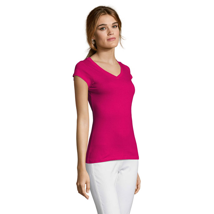 SOL'S MOON Dames t-shirt 150g/m². Het welbekende t-shirt met diepe V-hals . In de versie voor dames, getailleerd model. Perfect voor de modewereld. 100% halfgekamd katoen. Verstevigingsband in de nek. Aansluitende snit. V-hals met ribbord met elastaan. Met zijnaad.