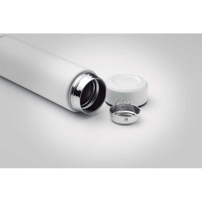 Dubbelwandige vacuüm geïsoleerde RVS drinkfles met uitneembare theezeef. Inhoud 425 ml. Lekvrij.