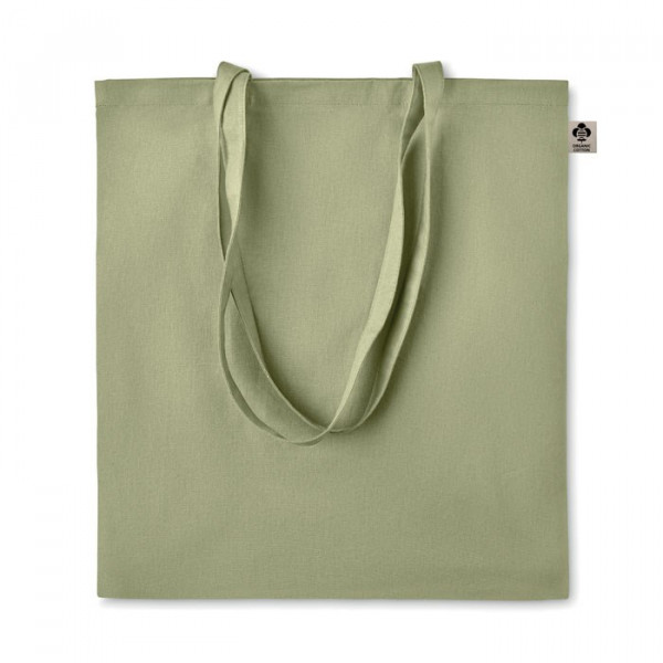 Boodschappentas van organisch katoen met lange hengsels. Een klassiek tote/draagtasontwerp gemaakt om je dagelijkse boodschappen of andere items in te vervoeren. Draag de tas in je handen of over je schouder met de lange hengsels. Gemaakt van 100% natuurlijk organisch katoen 140 gr / m².