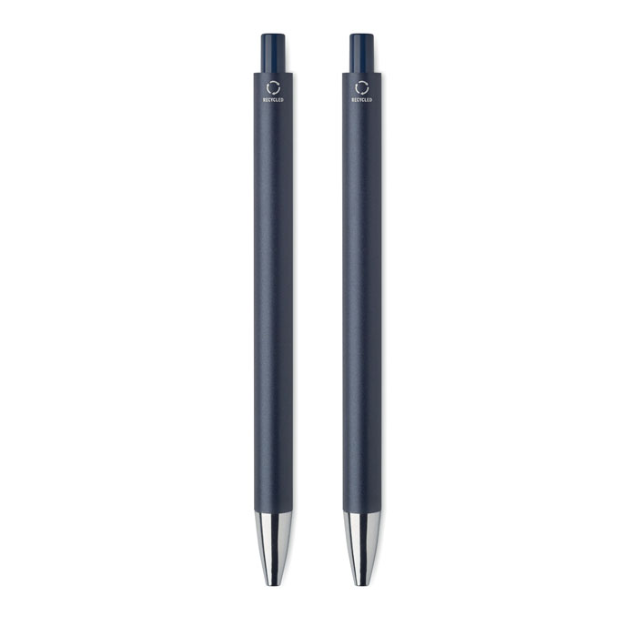 Gerecycled aluminium pennenset met 1 balpen blauwschrijvend en 1 pen grafiet inktloos. In gerecycled papieren doosje.