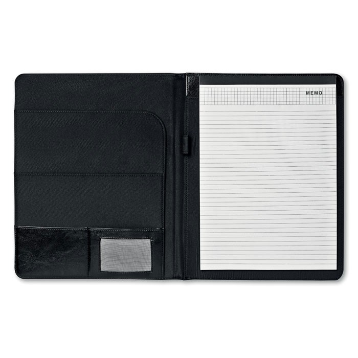 A4 schrijfmap van PU met metalen logoplaatje en notitieblok van 20 pagina’s.