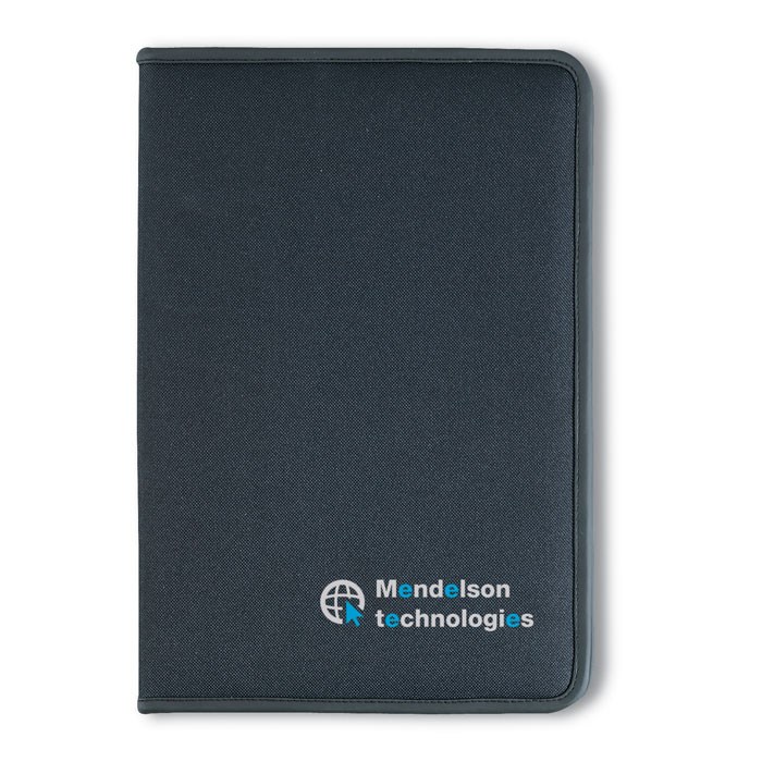A4 schrijfmap met rits, 4 vakken en visitekaarthouder. Inclusief schrijfblok met 20 vel. 600D polyester en 210T lining.
