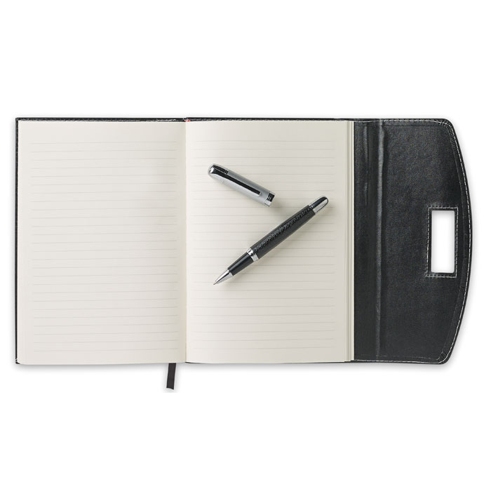 Schrijfmap van A5 formaat met contrasterende stiksels, inclusief 240 pagina's (120 vellen) gelinieerd papier en een metalen pen. PU materiaal. Zwarte inkt.