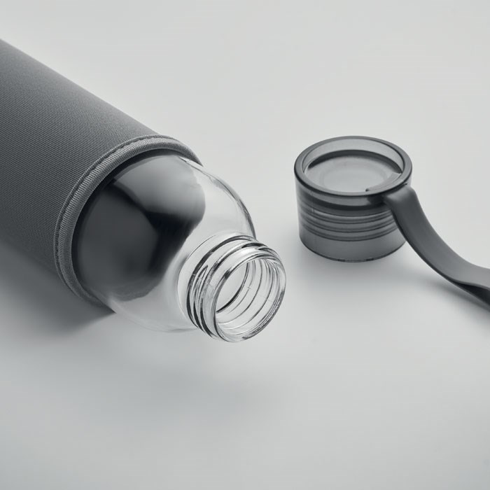 Gerecyclede glazen fles in neopreen pouch met PP dop en siliconen hanger. Lekvrij. Inhoud: 500 ml.