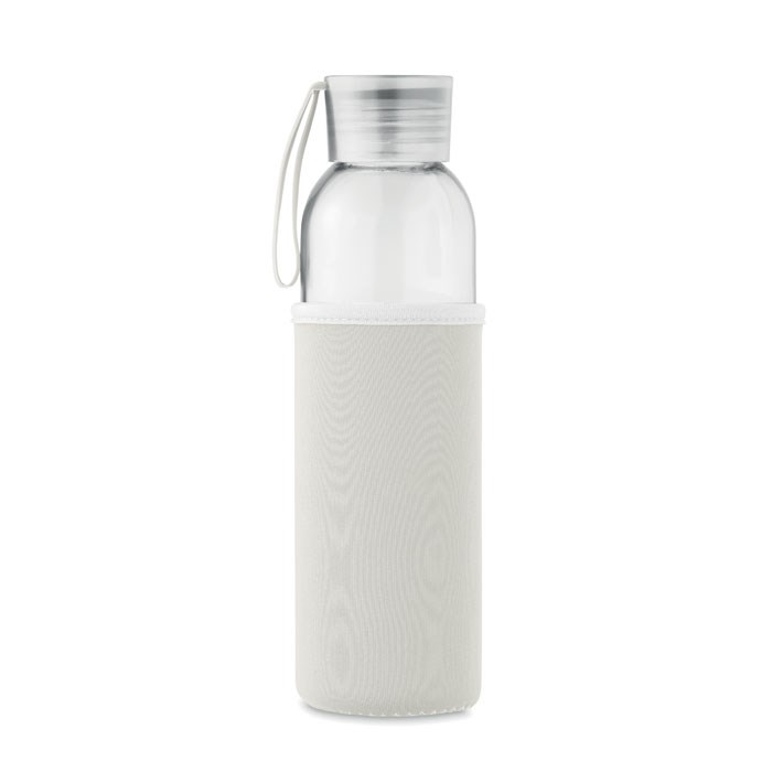 Gerecyclede glazen fles in neopreen pouch met PP dop en siliconen hanger. Lekvrij. Inhoud: 500 ml.