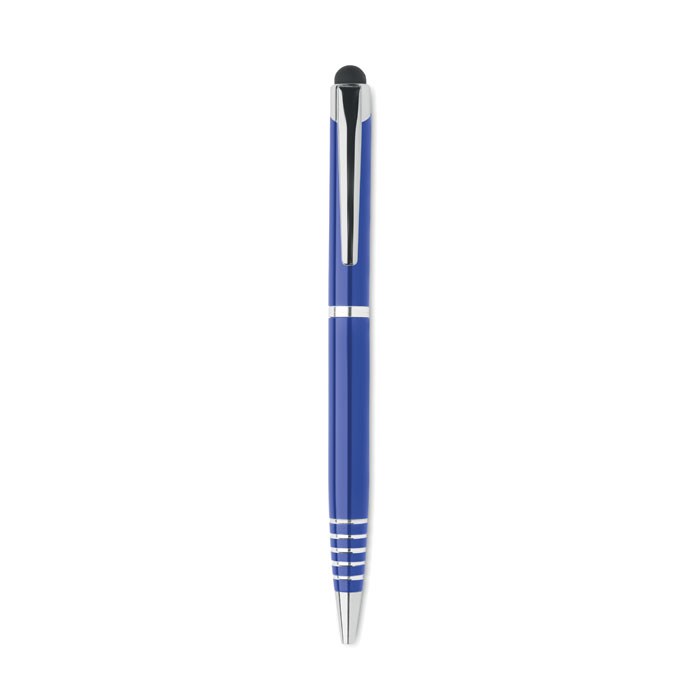 Balpen van gerecycled aluminium met stylus. Blauwe inkt.meer