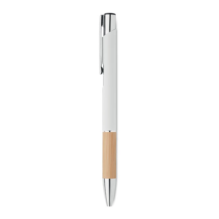 Pen met aluminium uiteinden en bamboe grip. Blauwe inkt.