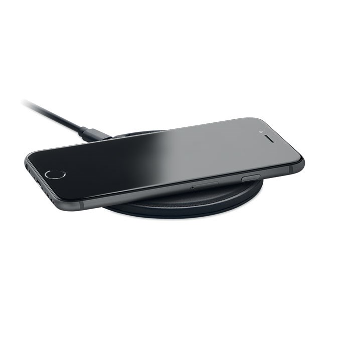 Draadloze oplader van gerecycled PU. Bestaat voor 58% uit gerecycled materiaal (40% gerecycled polyester en 18% gerecycled PU). Output: DC 9V/1.67A (15W) voor snel opladen.