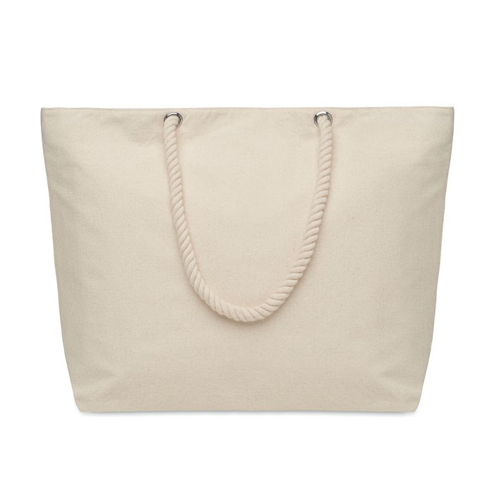 Strand- of boodschappentas van gerecycled katoen (80% gerecycled katoen, 20% gewoon katoen) met koordhengsels. 220 gr/m².