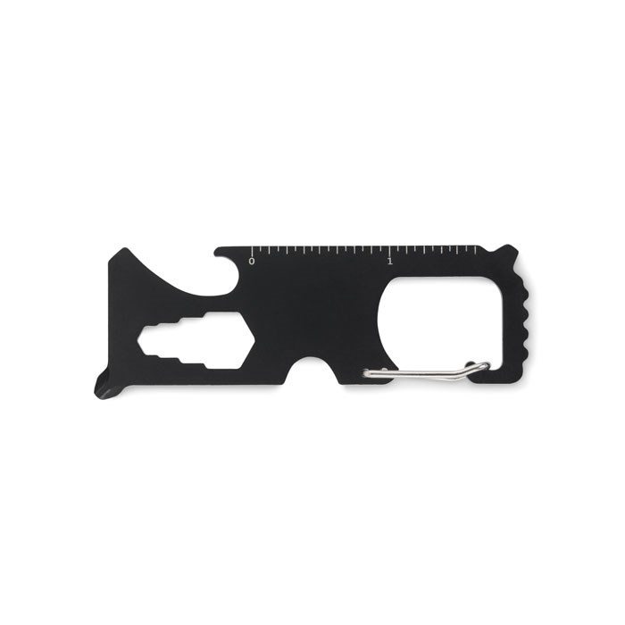 Roestvrijstalen multitool voor zakkaarten. 8 functies. Inclusief: tandzaag, draadknipper, moersleutel, kruiskopschroevendraaier, sleufschroevendraaier, maatverdeling, flesopener en sleutelhanger.