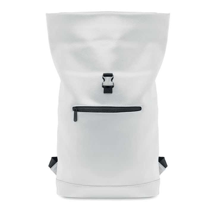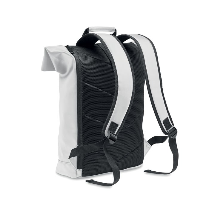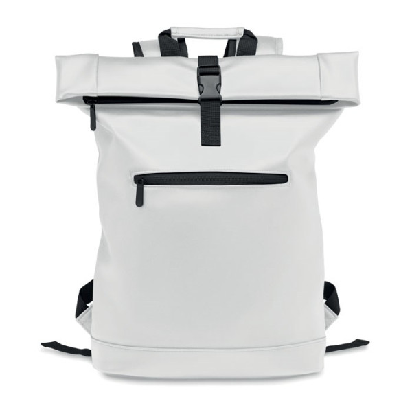 15 inch rolltop laptoprugzak van zacht PU met gewatteerde achterkant en verstevigde bodem. Groot voorvak met rits. De voering is 210D RPET.