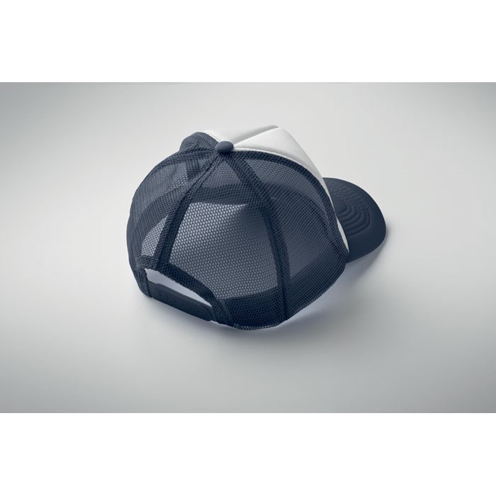 Truckers baseballpet van polyester 140-150 gr/m²met verstelbare sluiting. Witte voorzijde en gekleurde klep van polyester jersey met schuimrug. 5 Panelen. Andere panelen in gekleurde mesh. Size 7 1/4